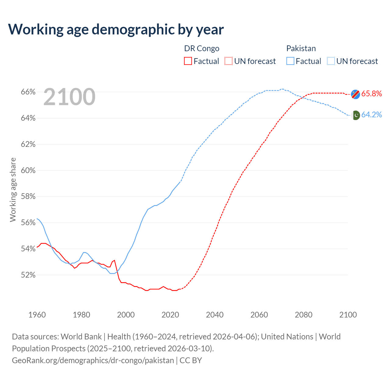 - The DR Congo has 59.8M working age adults (aged 15-64) vs 154M in Pakistan.