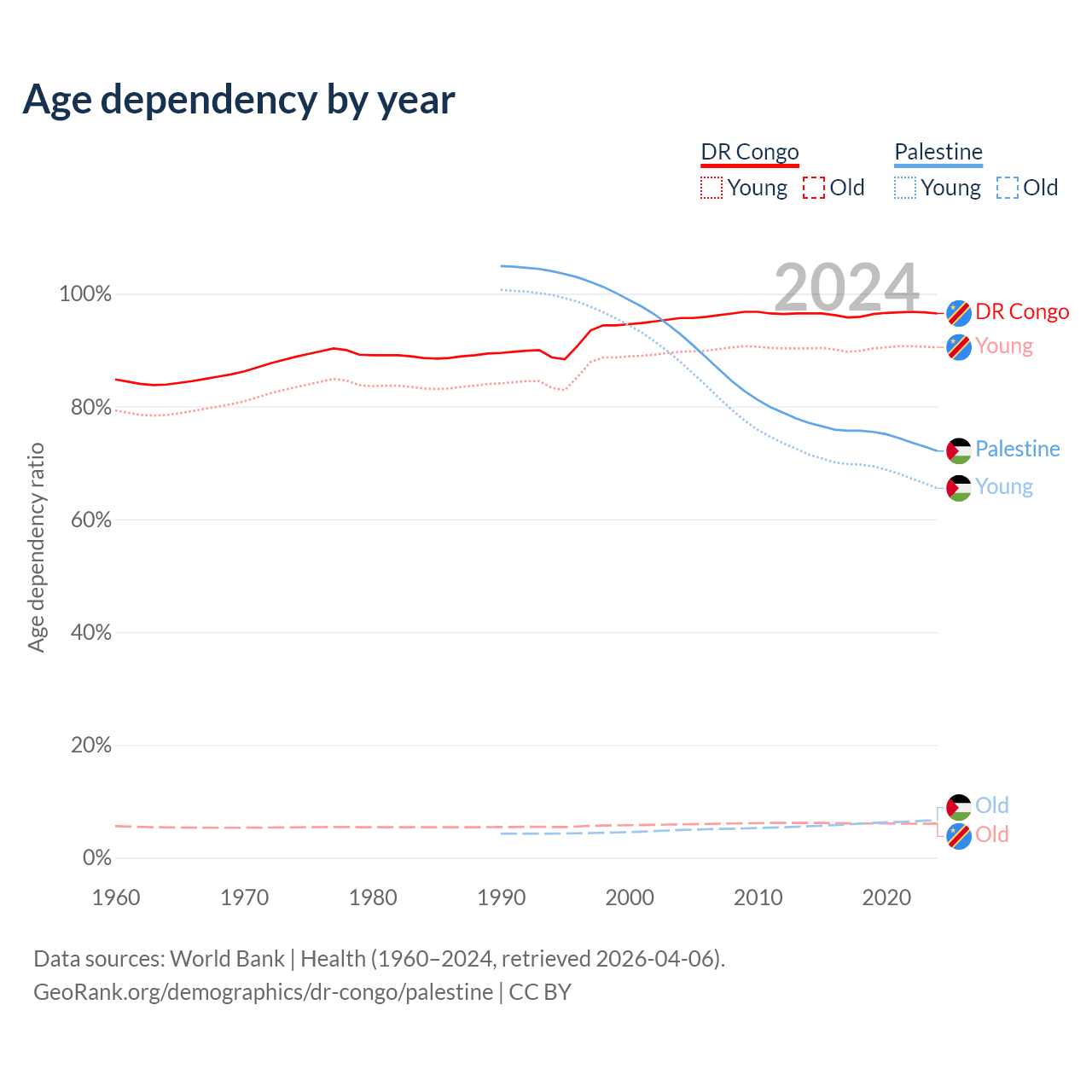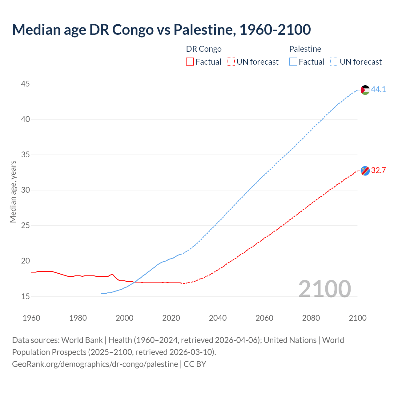- The DR Congo is ranked 191/196 by median age (oldest to youngest) vs 157/196 for Palestine.
