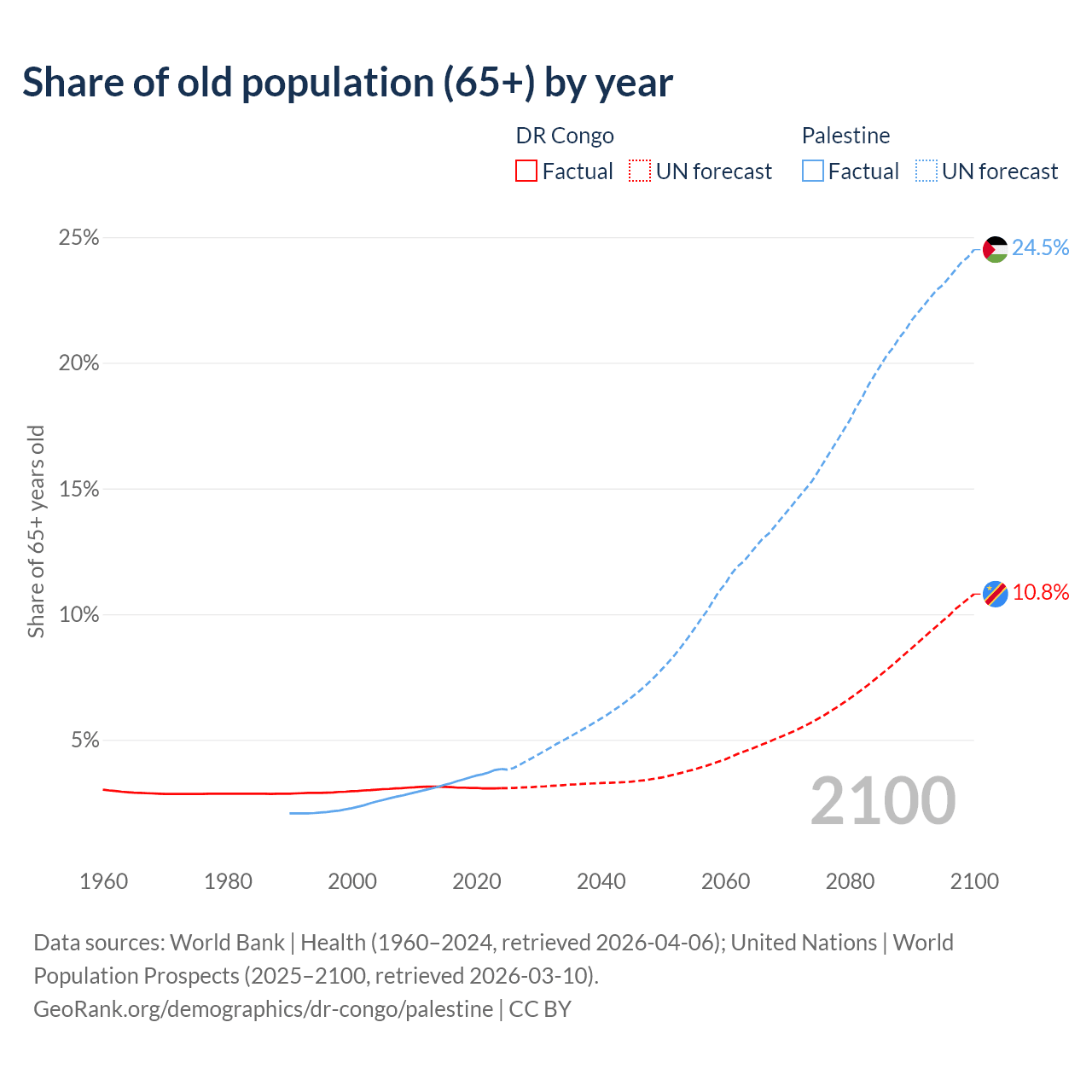 - The share of old-age demographic (65+) in the DR Congo is 3.08% vs 3.84% in Palestine.