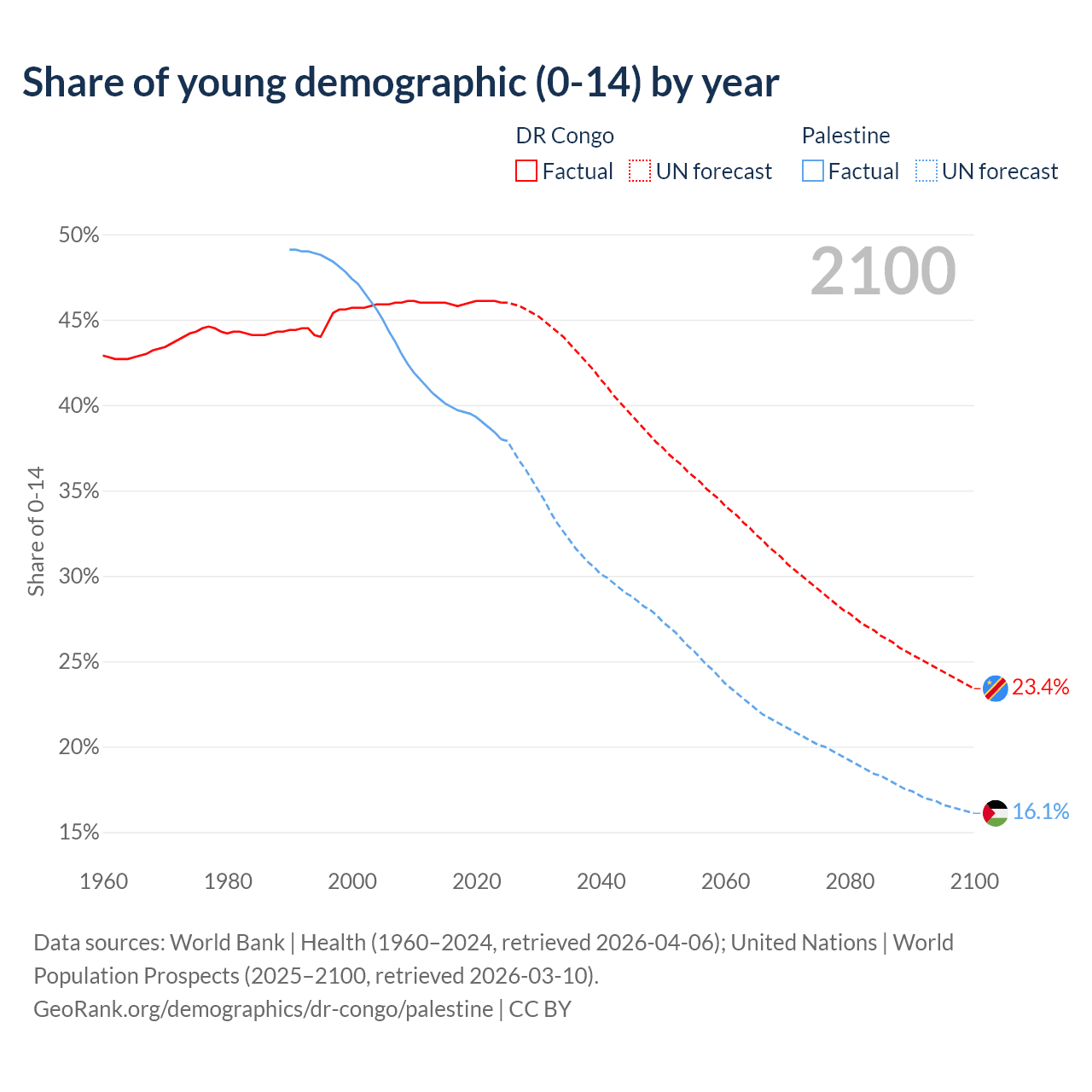 - The share of young demographic (0-15 years old) in the DR Congo is 46% vs 38% in Palestine.
