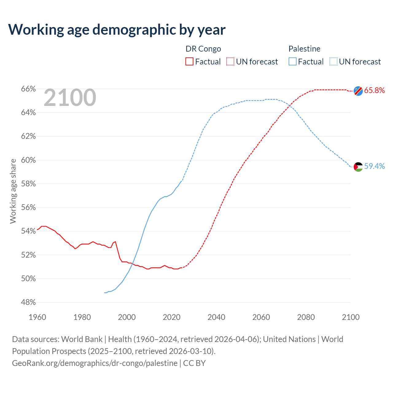 - The DR Congo has 59.8M working age adults (aged 15-64) vs 3.2M in Palestine.