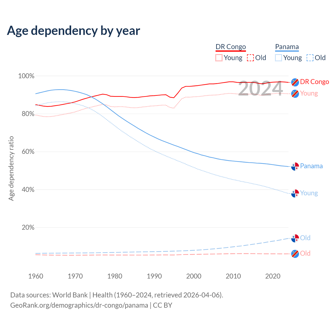 - The share of old-age demographic (65+) in the DR Congo is 3.08% vs 9.35% in Panama.