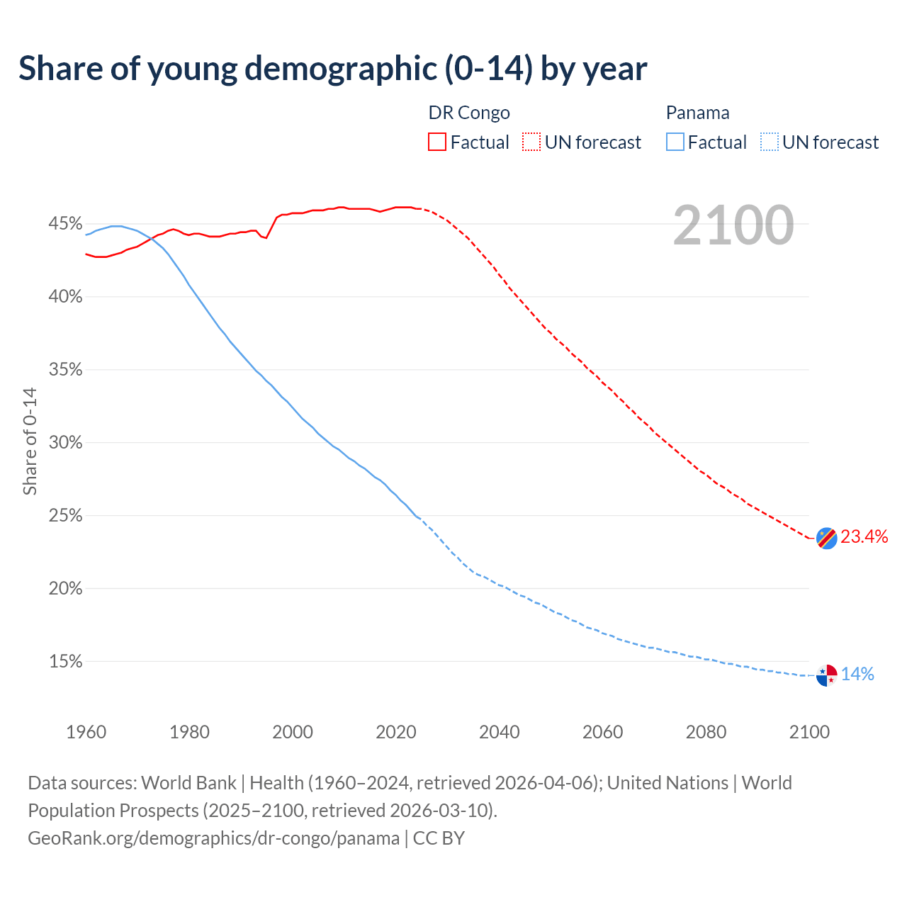 - The share of young demographic (0-15 years old) in the DR Congo is 46% vs 24.9% in Panama.
