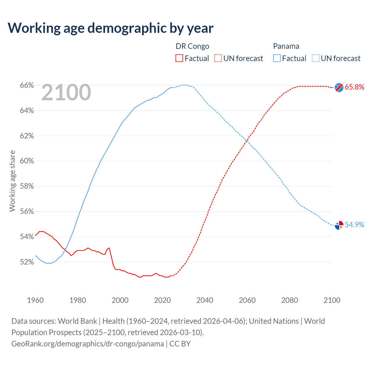 - The DR Congo has 59.8M working age adults (aged 15-64) vs 3.05M in Panama.