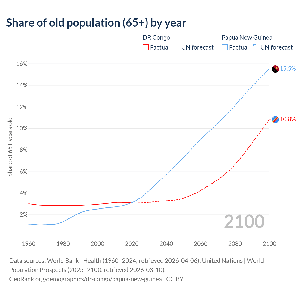 - The share of old-age demographic (65+) in the DR Congo is 3.08% vs 3.46% in Papua New Guinea.