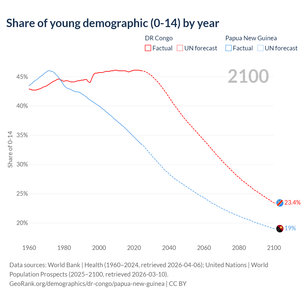 - The share of young demographic (0-15 years old) in the DR Congo is 46% vs 33.5% in Papua New Guinea.