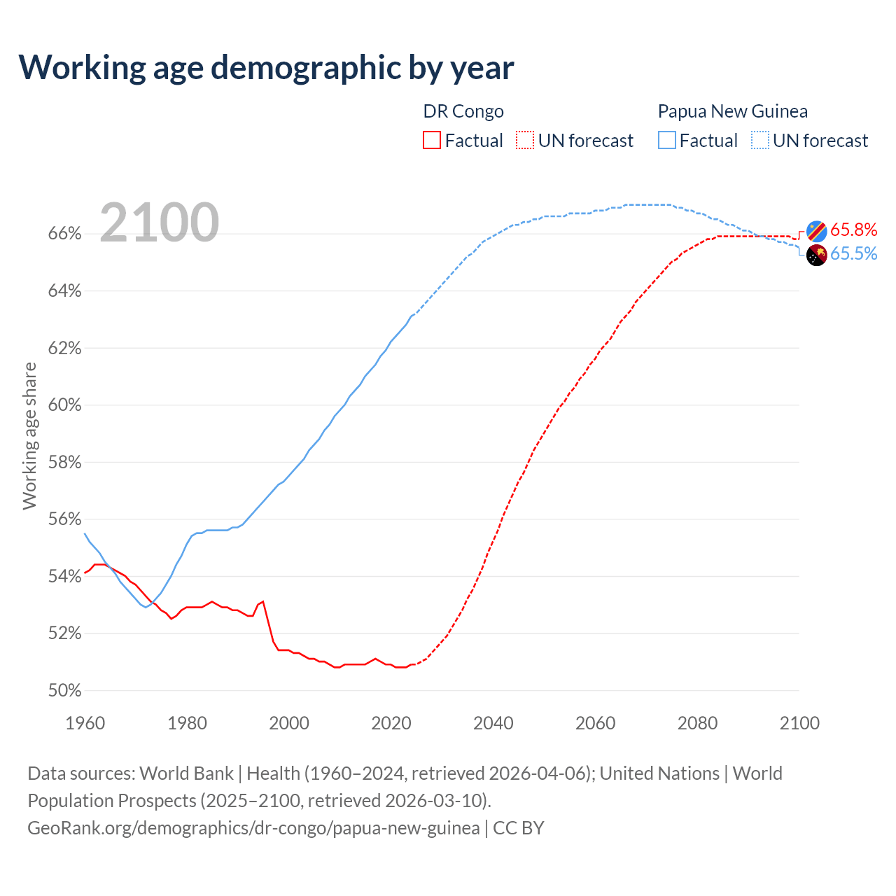 Median age DR Congo vs Papua New Guinea, 1960-2100