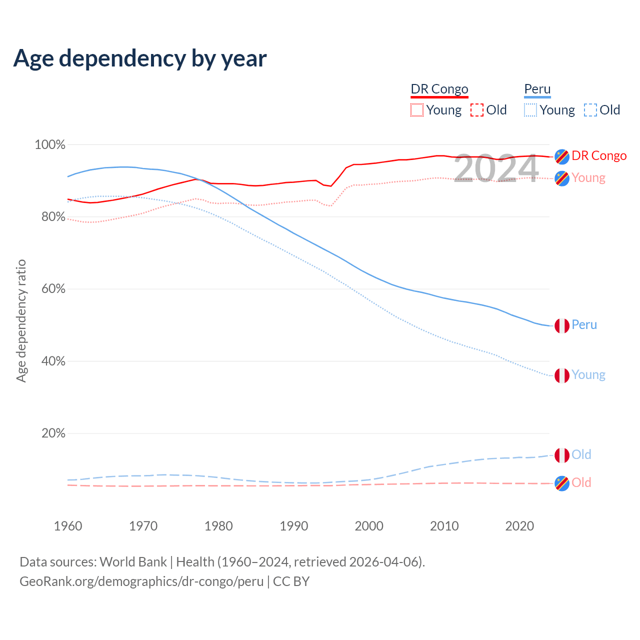 - The share of old-age demographic (65+) in the DR Congo is 3.08% vs 9.23% in Peru.