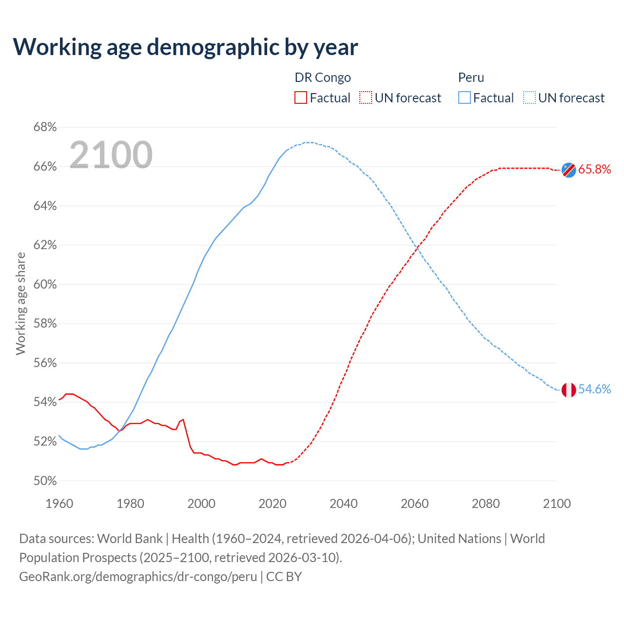 - The DR Congo has 59.8M working age adults (aged 15-64) vs 23.4M in Peru.