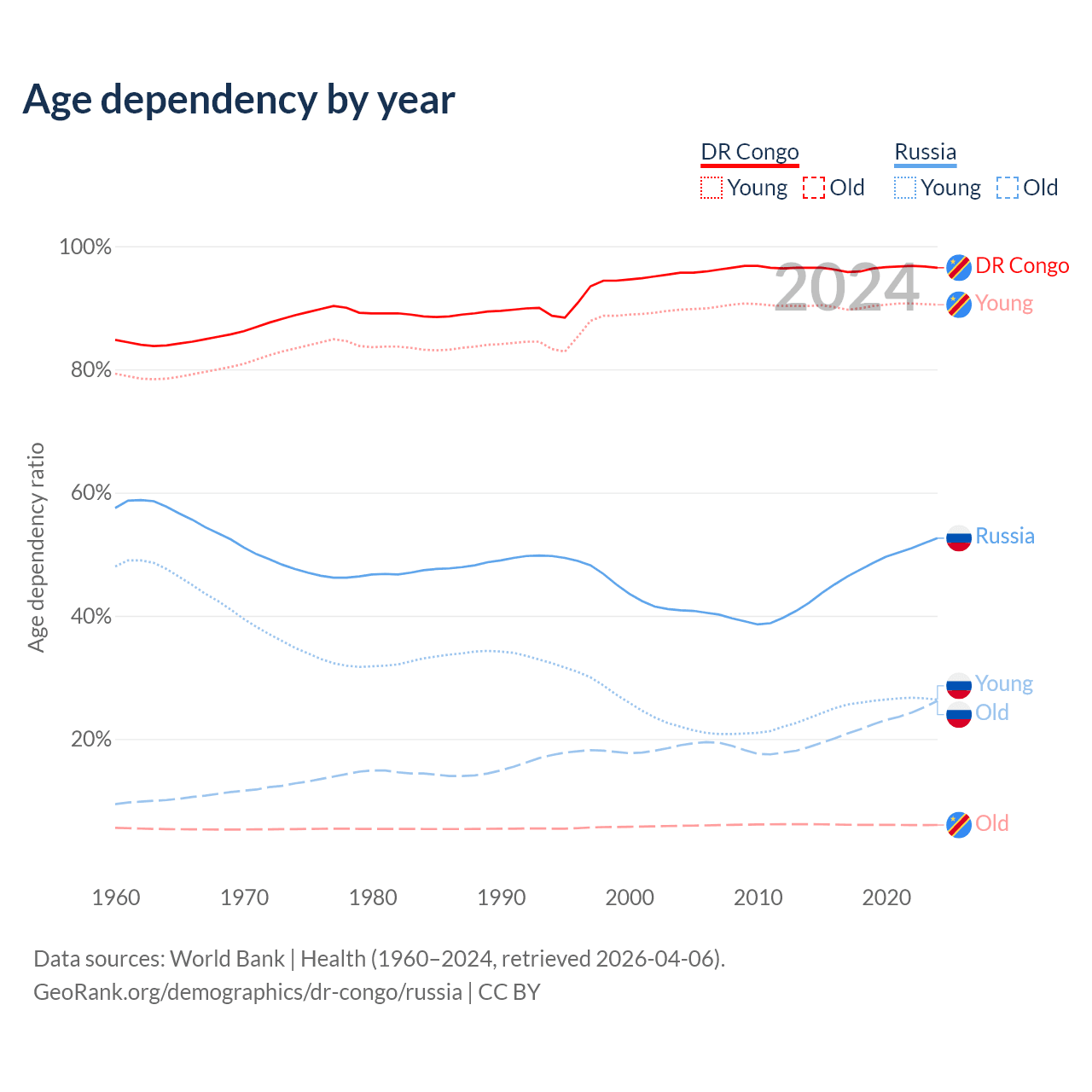 - The share of old-age demographic (65+) in the DR Congo is 3.08% vs 17.2% in Russia.