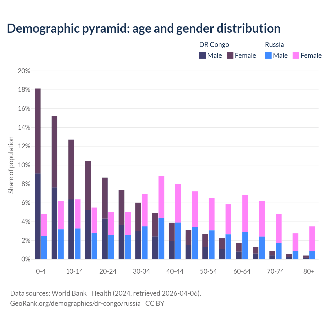 - The DR Congo is ranked 191/196 by median age (oldest to youngest) vs 42/196 for Russia.
