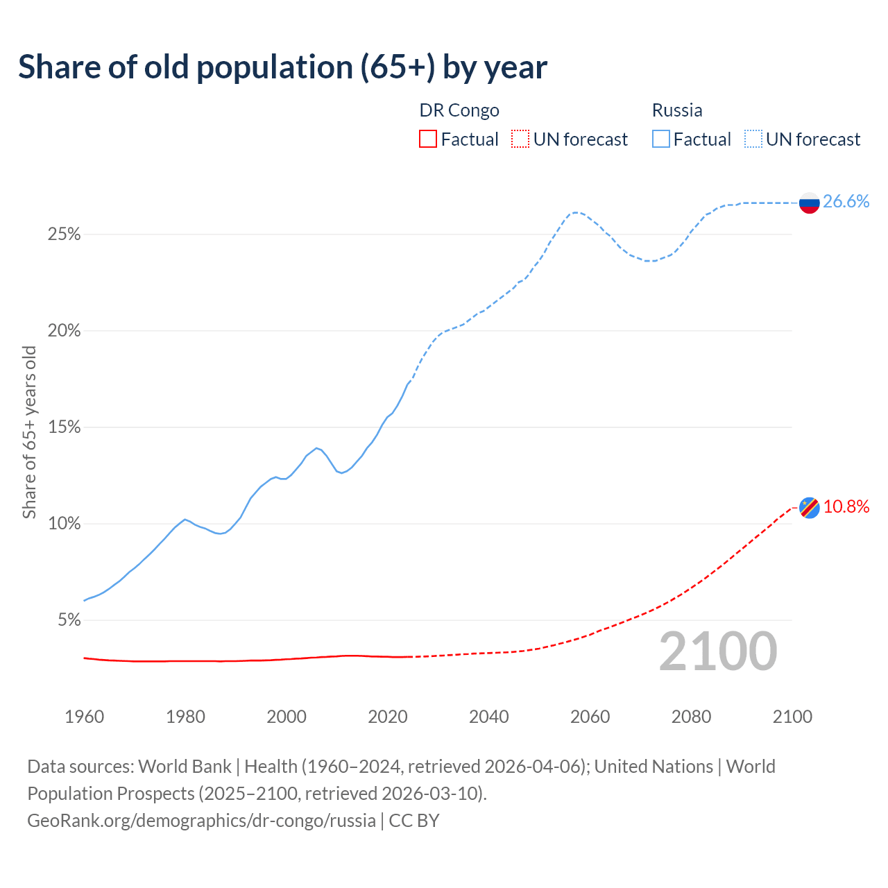 The share of older people aged 65 and over is 3.08% in the DR Congo and 17.2% in Russia. Life expectancy in the DR Congo compared to Russia .