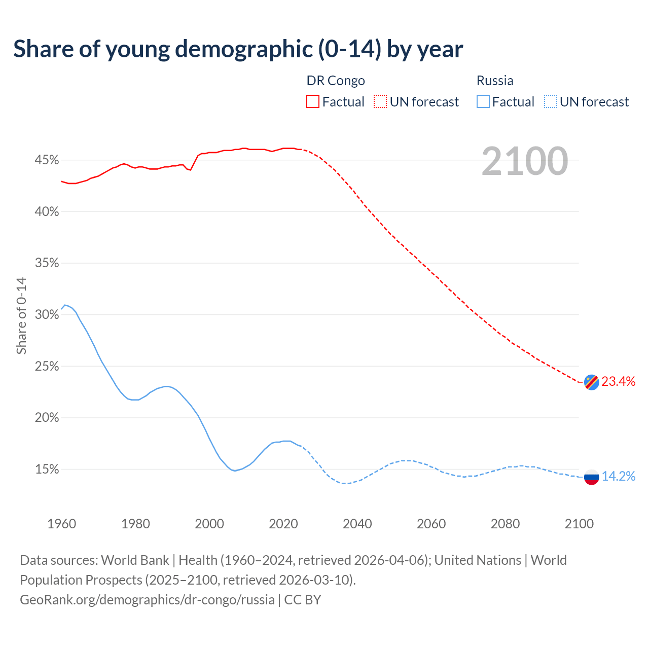 - The share of young demographic (0-15 years old) in the DR Congo is 46% vs 17.3% in Russia.