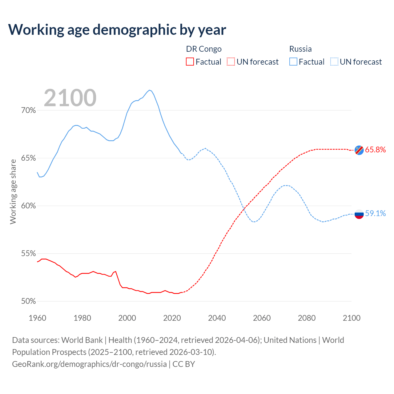 - The DR Congo has 59.8M working age adults (aged 15-64) vs 93M in Russia.