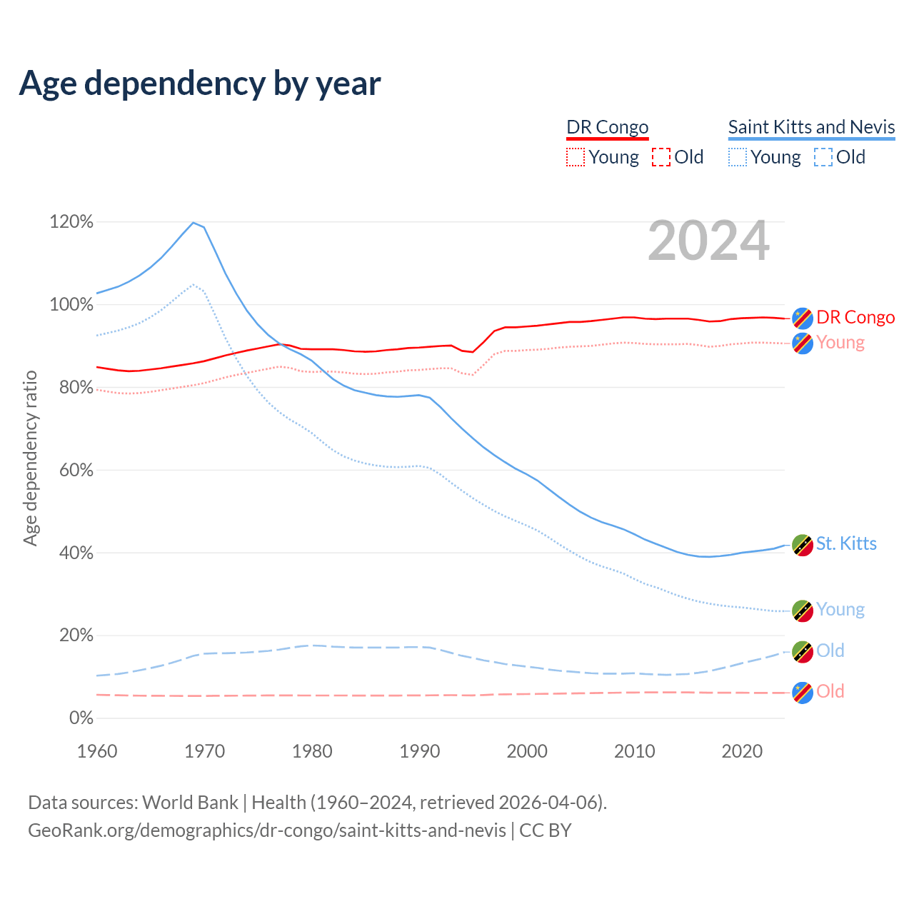 - The share of old-age demographic (65+) in the DR Congo is 3.08% vs 11.2% in Saint Kitts and Nevis.
