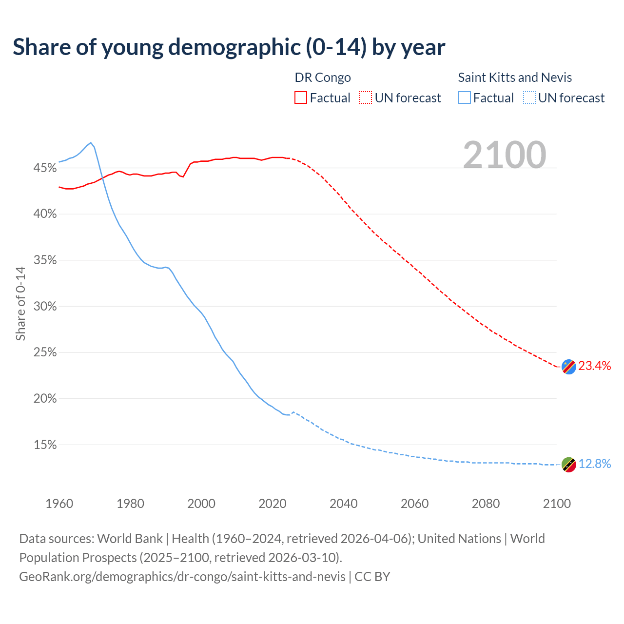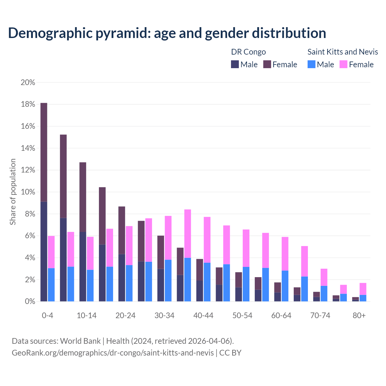 - The share of young demographic (0-15 years old) in the DR Congo is 46% vs 18.2% in Saint Kitts and Nevis.