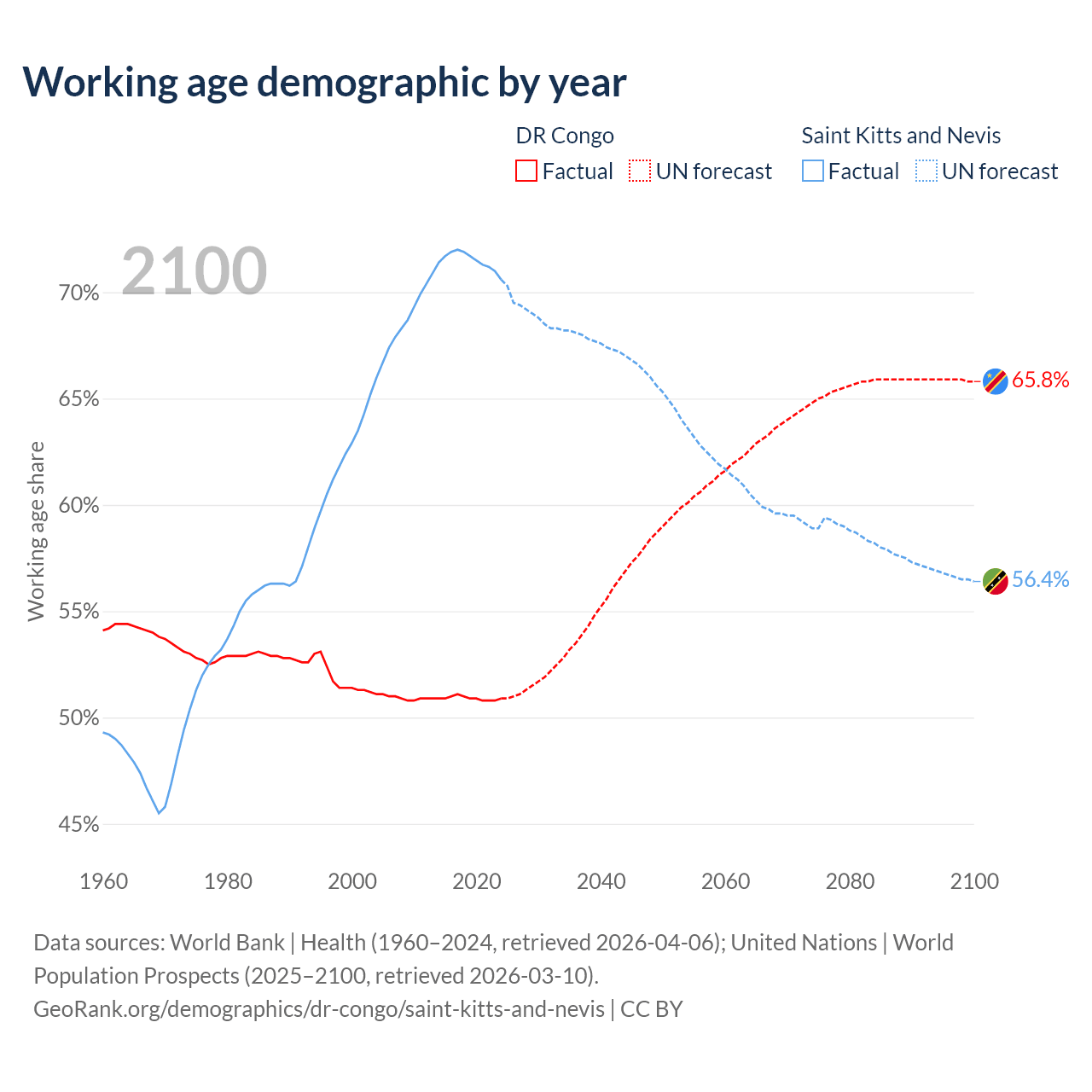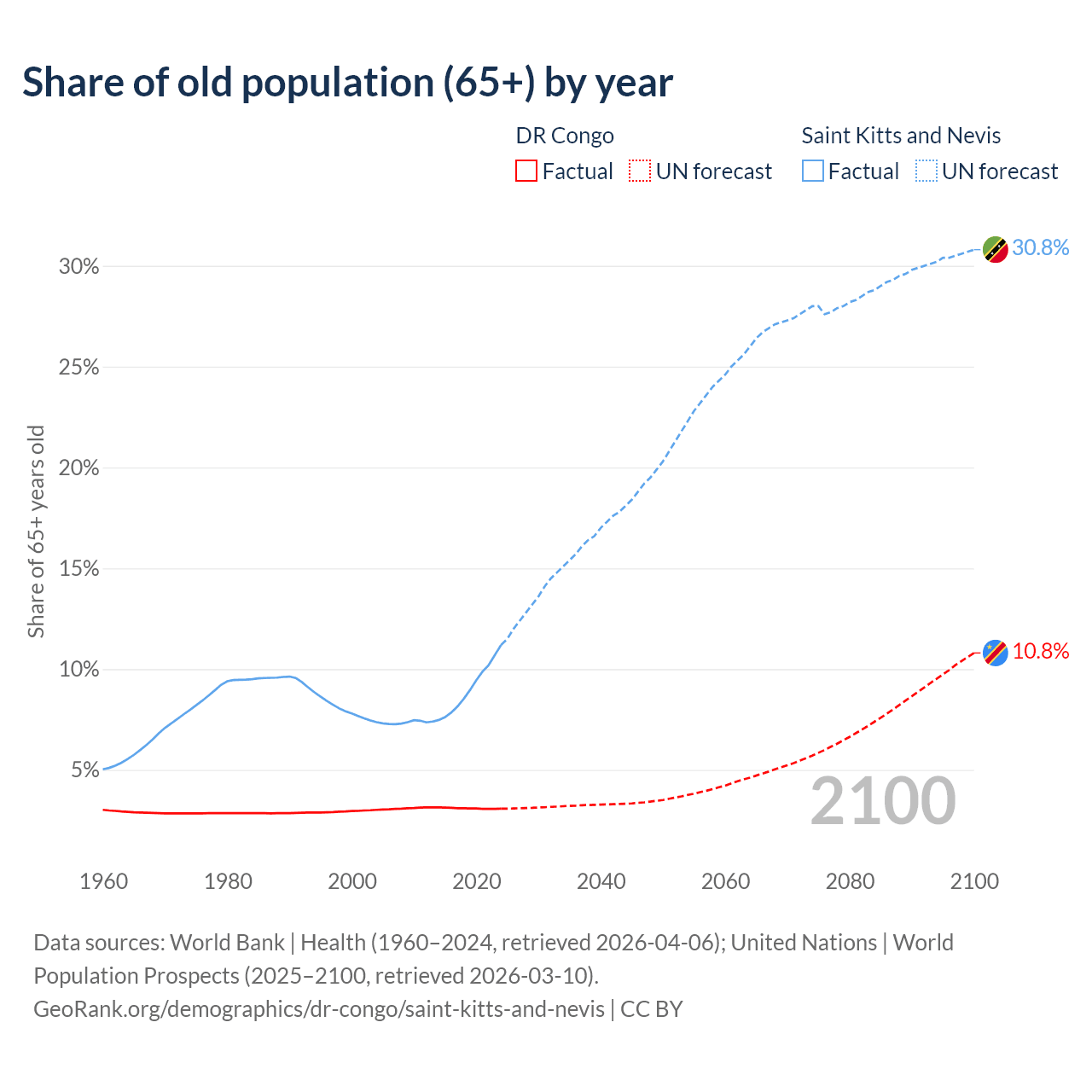 The share of older people aged 65 and over is 3.08% in the DR Congo and 11.2% in Saint Kitts and Nevis. Life expectancy in the DR Congo compared to Saint Kitts and Nevis .