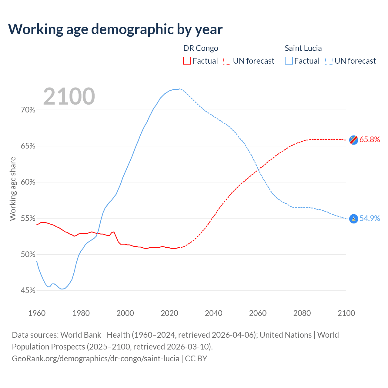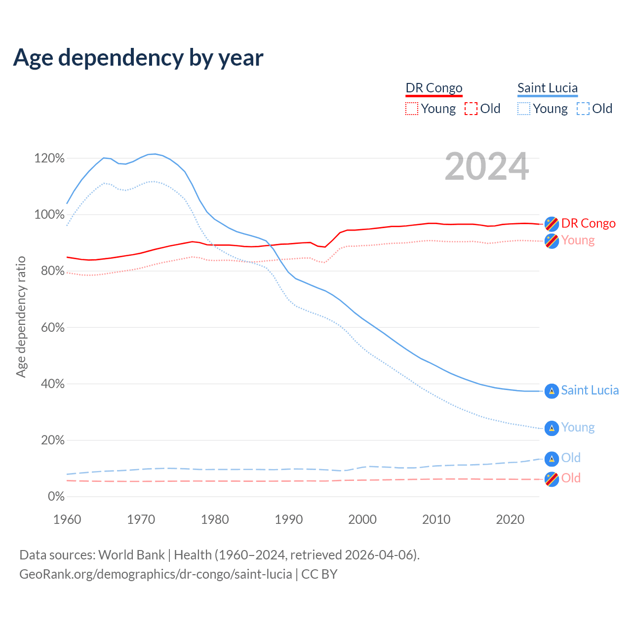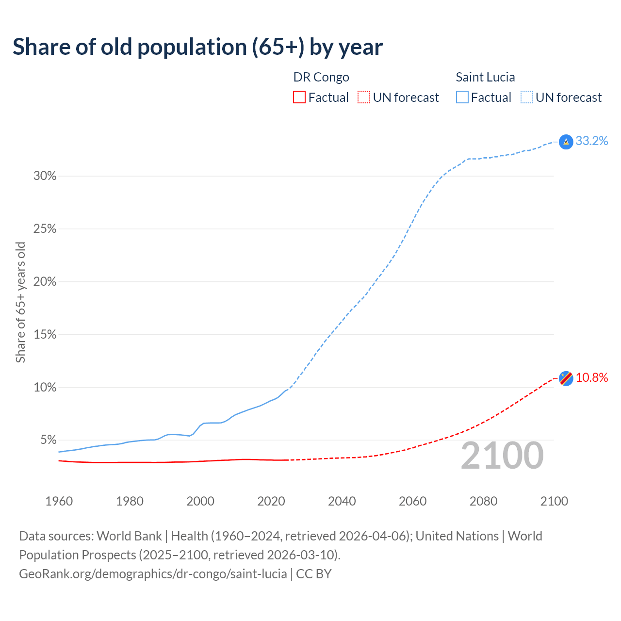 - The share of old-age demographic (65+) in the DR Congo is 3.08% vs 9.62% in Saint Lucia.