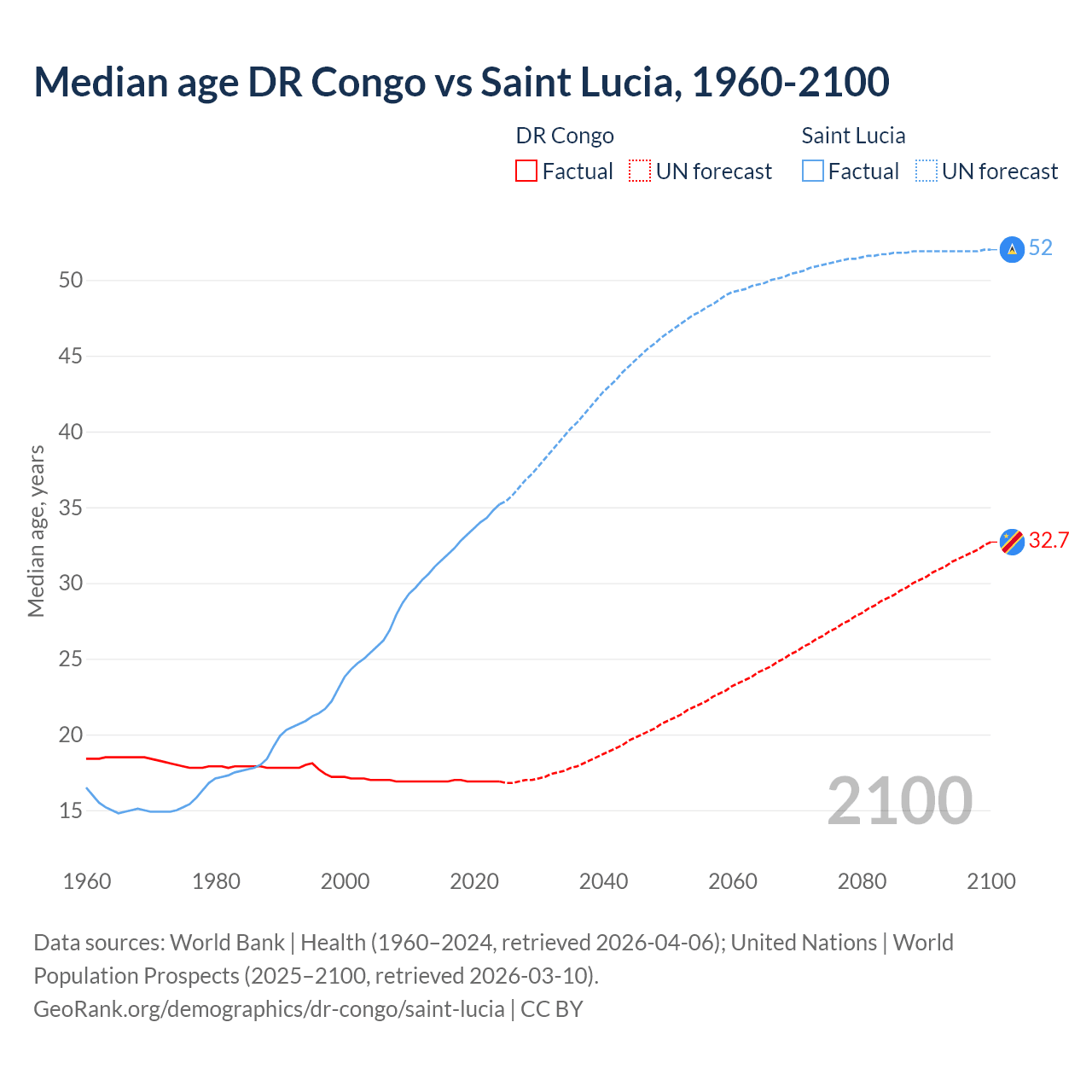 Median age DR Congo vs Saint Lucia, 1960-2100