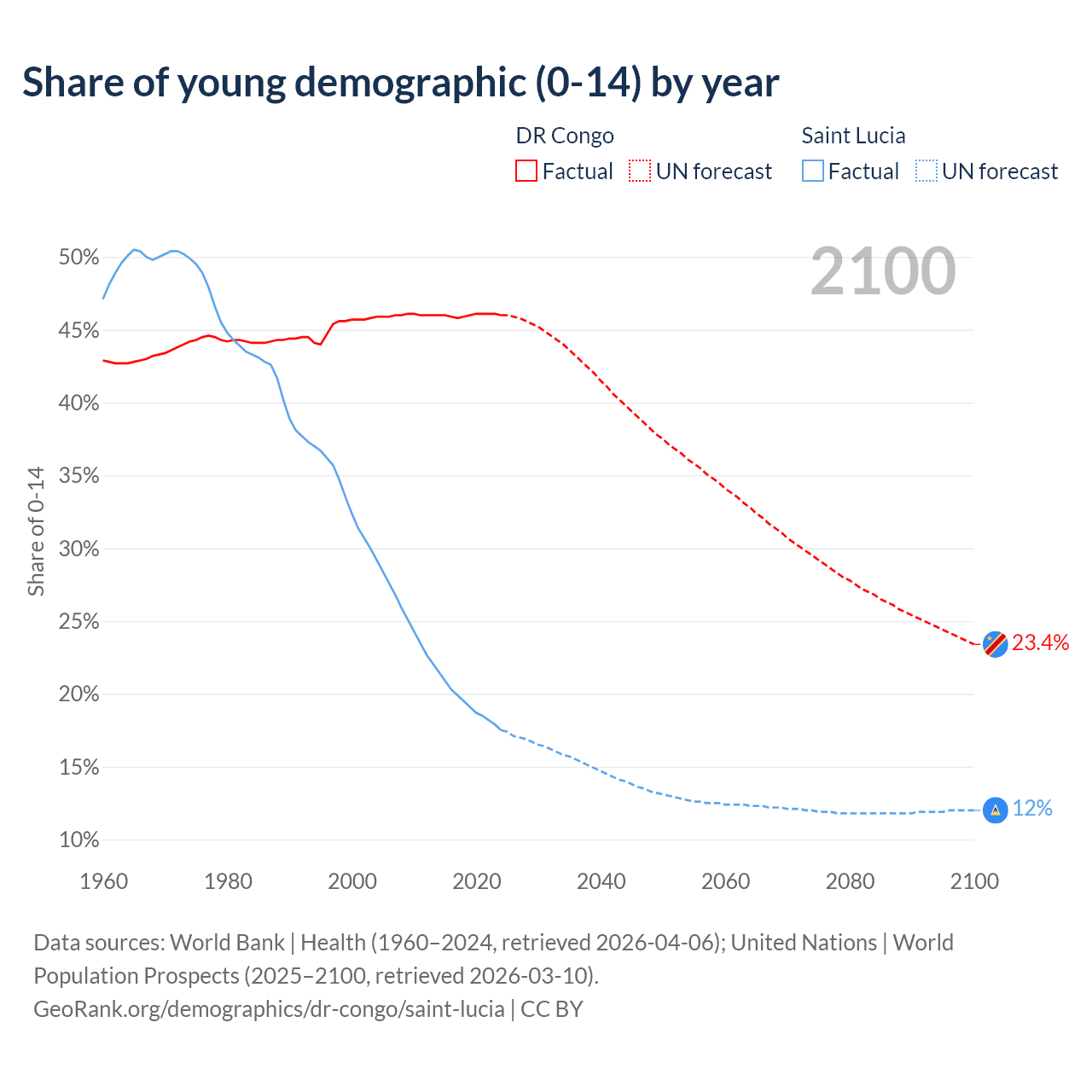 - The share of young demographic (0-15 years old) in the DR Congo is 46% vs 17.5% in Saint Lucia.
