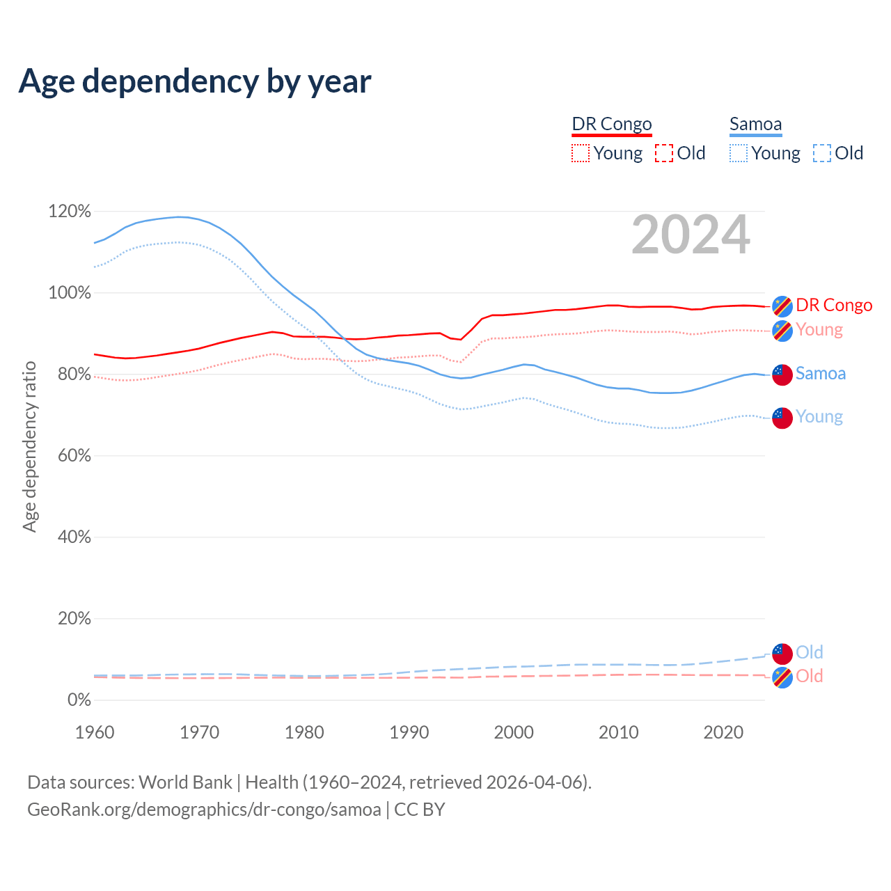 - The share of old-age demographic (65+) in the DR Congo is 3.08% vs 5.88% in Samoa.