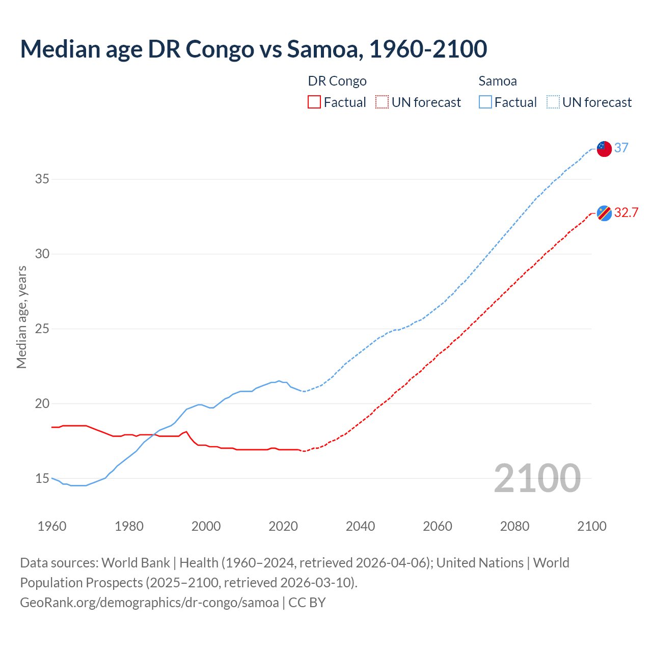 - The DR Congo is ranked 191/196 by median age (oldest to youngest) vs 158/196 for Samoa.
