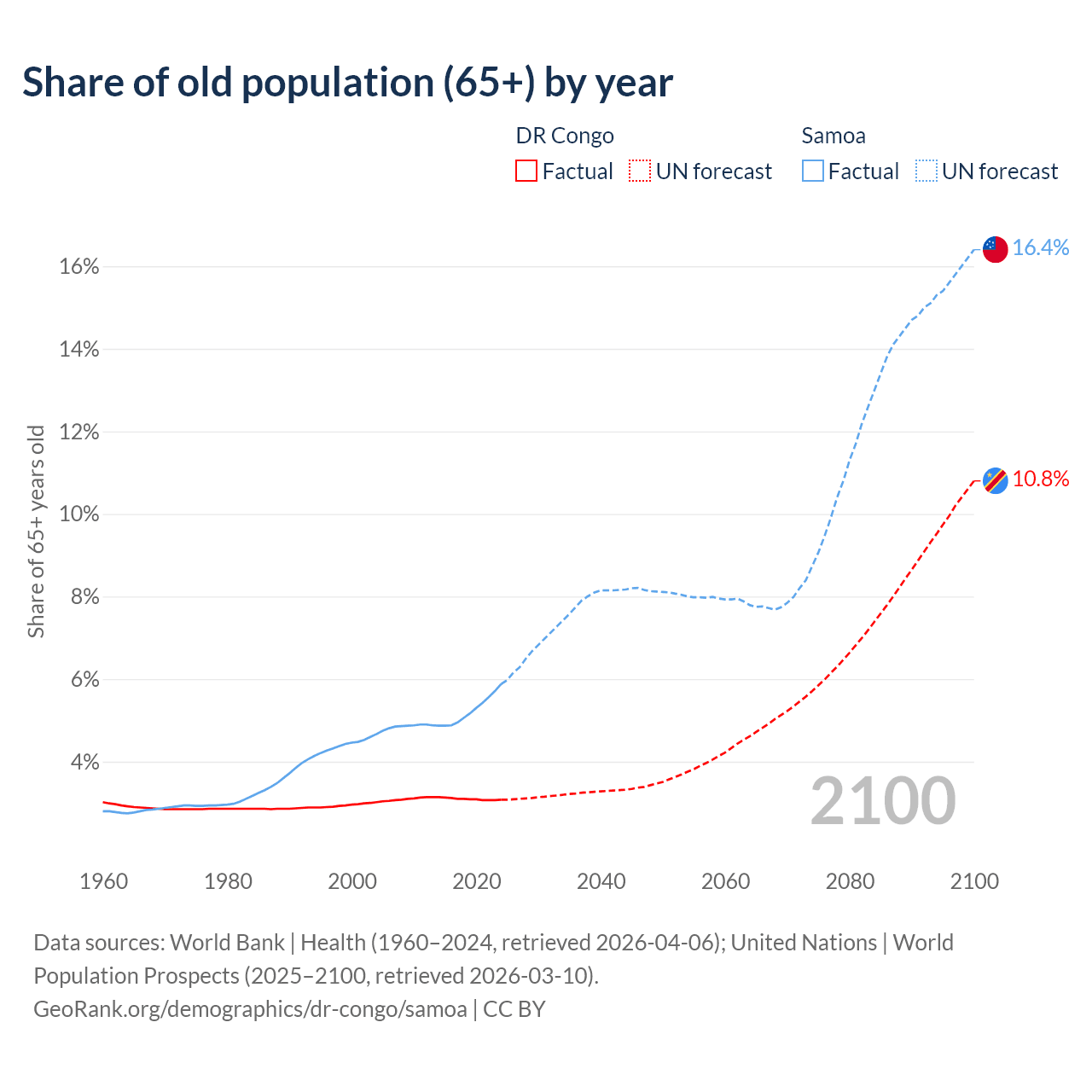 The share of older people aged 65 and over is 3.08% in the DR Congo and 5.88% in Samoa. Life expectancy in the DR Congo compared to Samoa .