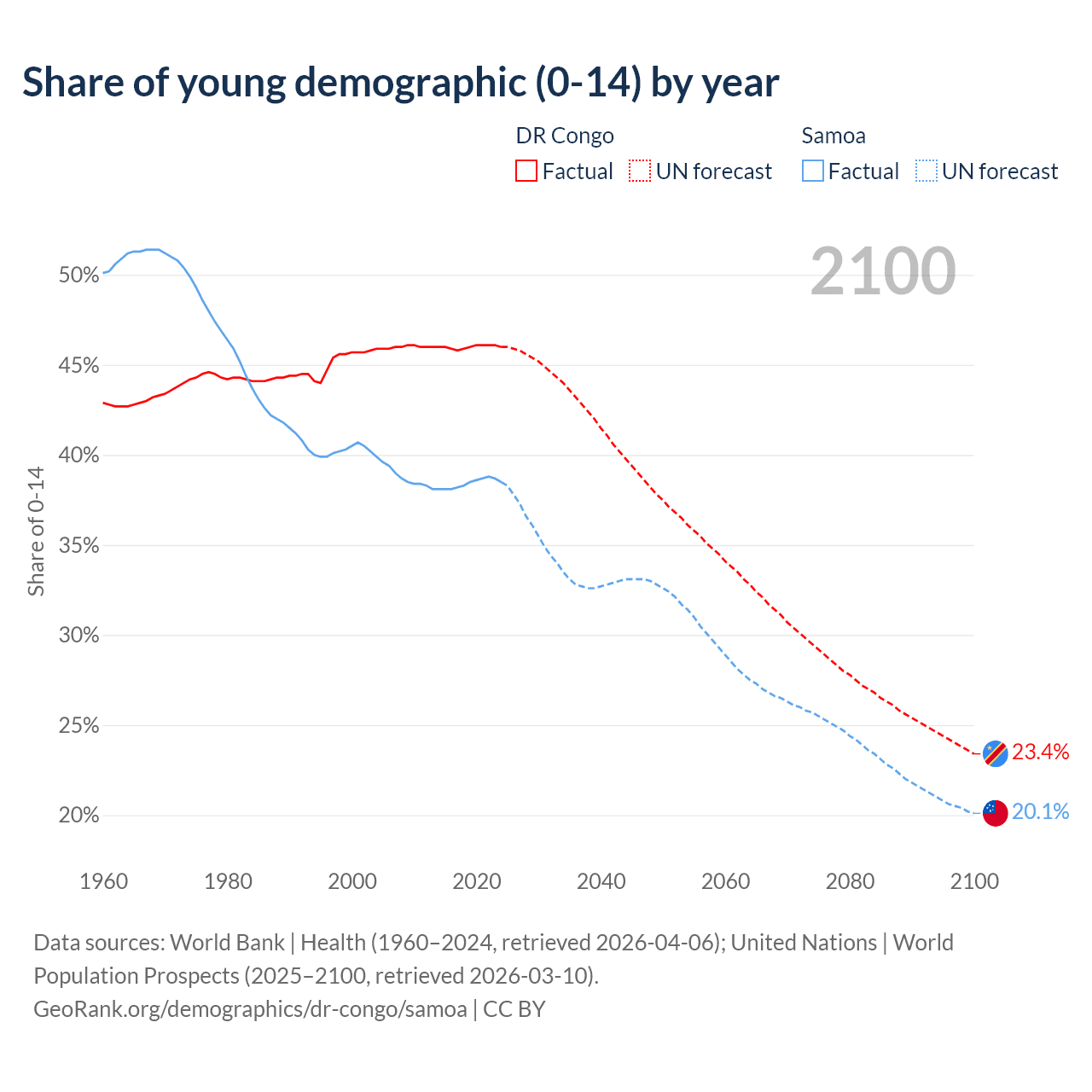 - The share of young demographic (0-15 years old) in the DR Congo is 46% vs 38.5% in Samoa.