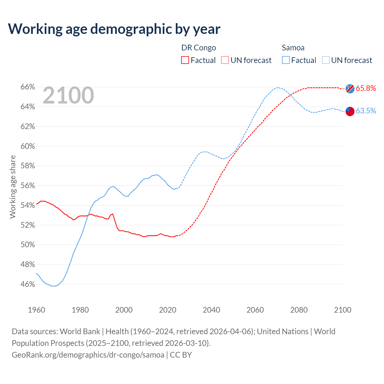 - The DR Congo has 59.8M working age adults (aged 15-64) vs 123K in Samoa.