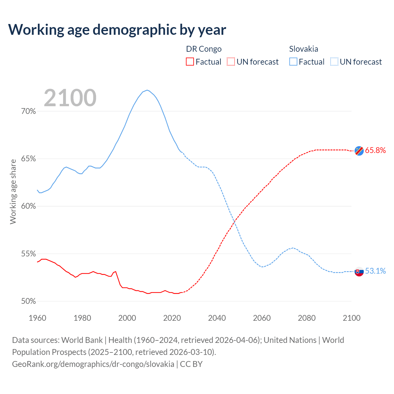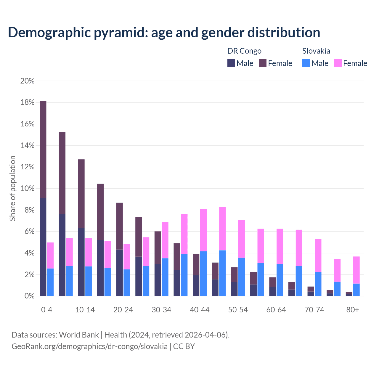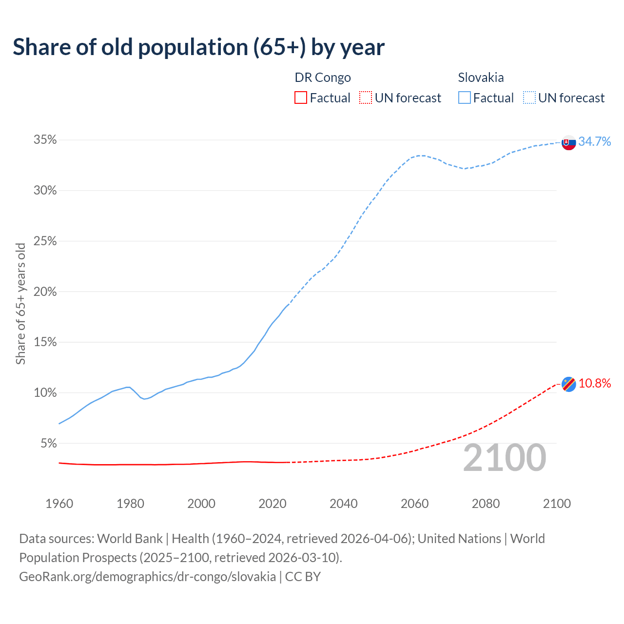 - The share of old-age demographic (65+) in the DR Congo is 3.08% vs 18.5% in Slovakia.