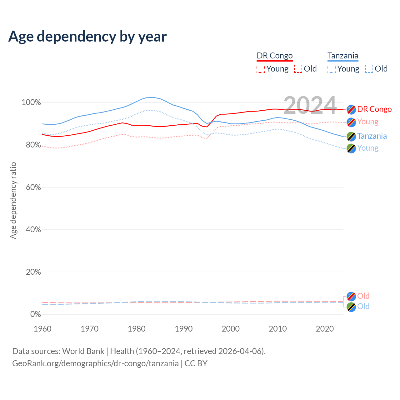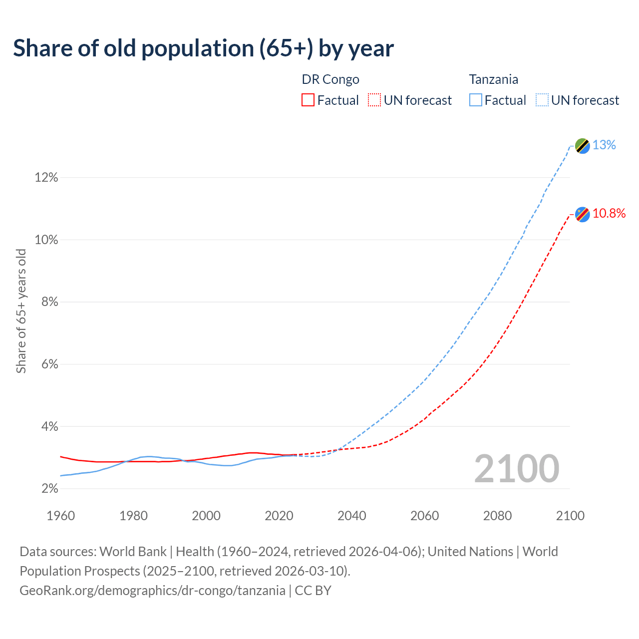 - The share of old-age demographic (65+) in the DR Congo is 3.08% vs 3.05% in Tanzania.