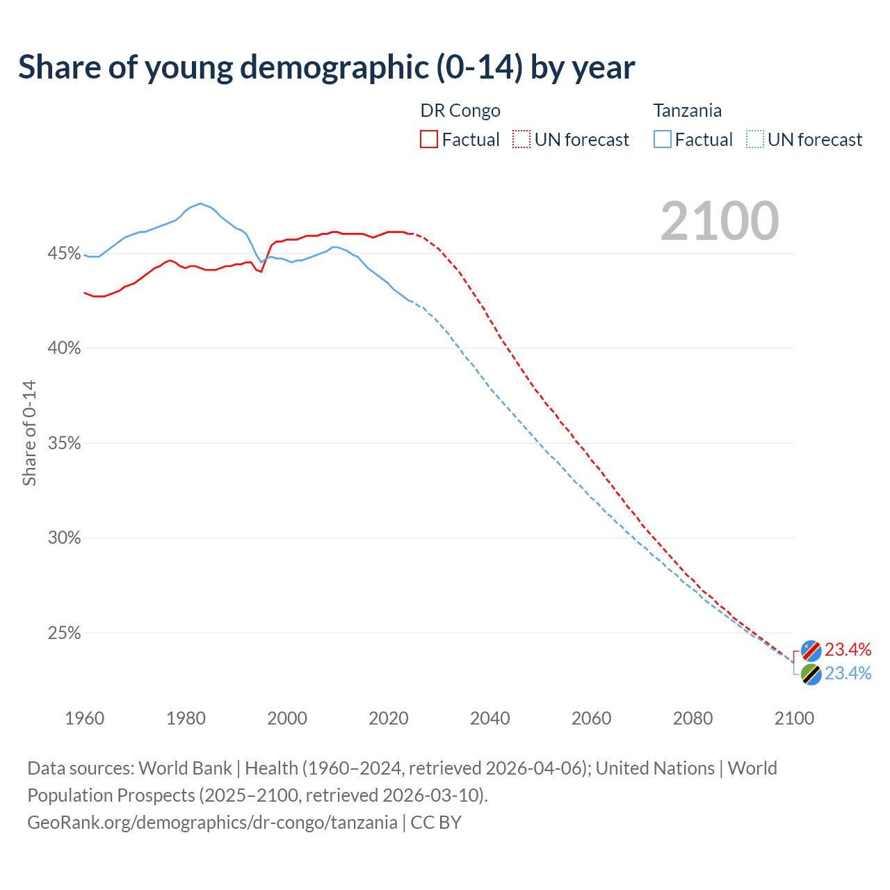 - The share of young demographic (0-15 years old) in the DR Congo is 46% vs 42.5% in Tanzania.