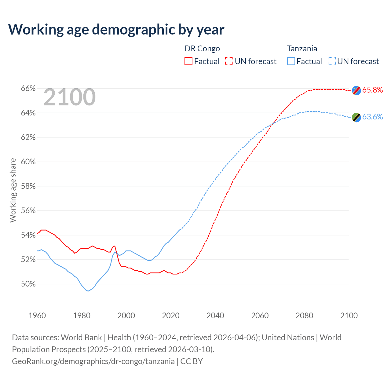 - The DR Congo has 59.8M working age adults (aged 15-64) vs 39.8M in Tanzania.