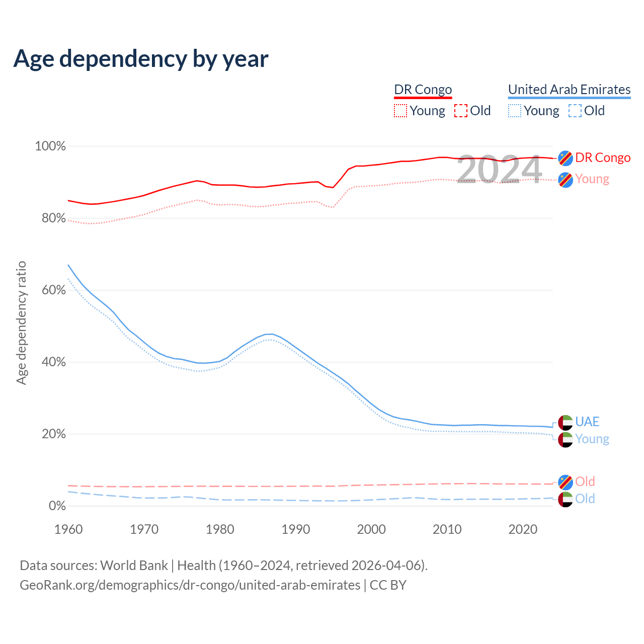 - The DR Congo is ranked 191/196 by median age (oldest to youngest) vs 91/196 for the United Arab Emirates.