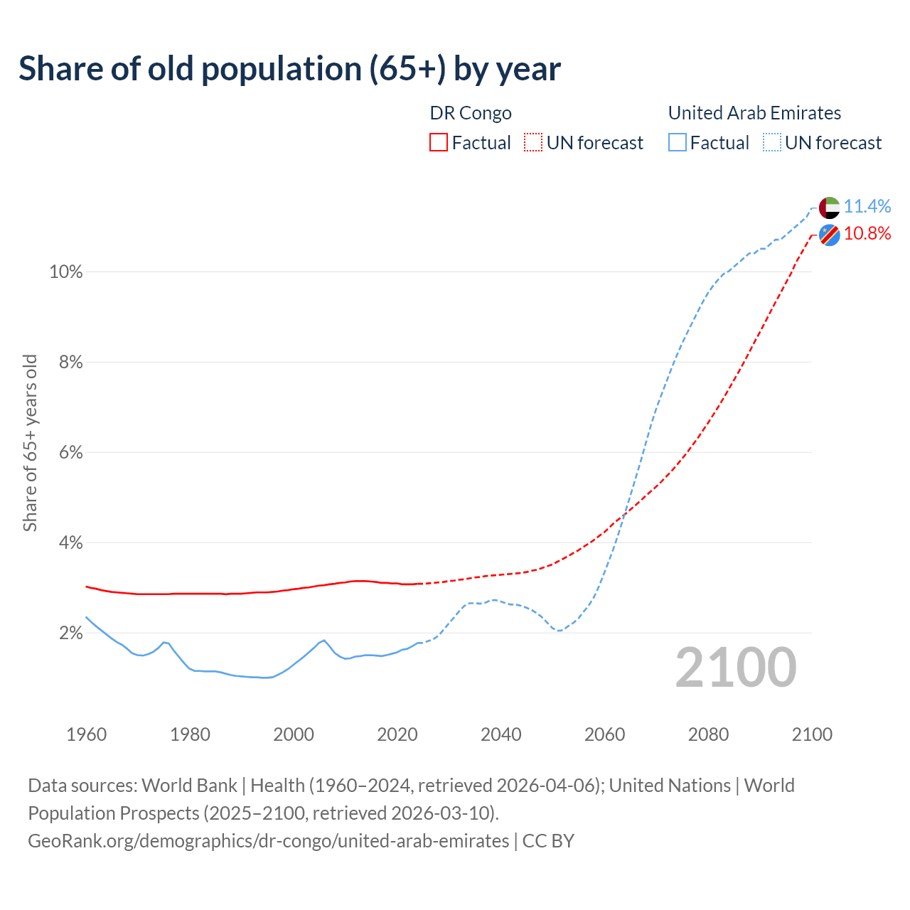 The share of older people aged 65 and over is 3.08% in the DR Congo and 1.77% in the United Arab Emirates. Life expectancy in the DR Congo compared to the United Arab Emirates .