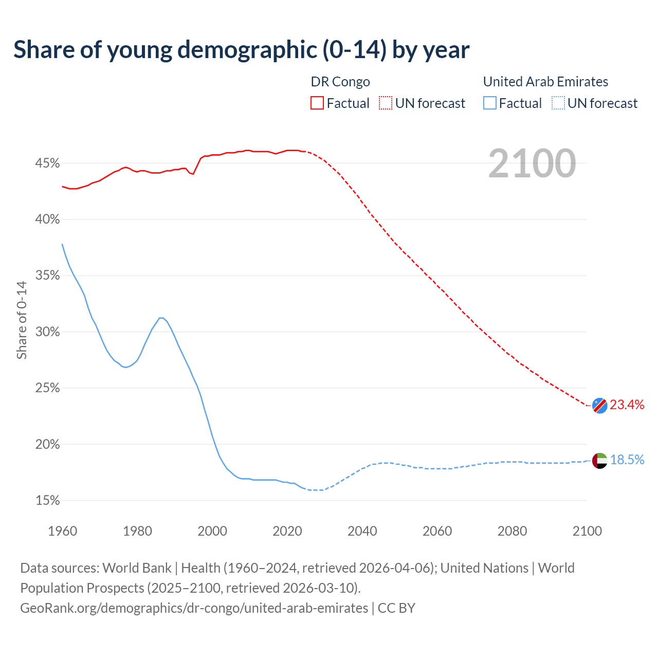 - The share of young demographic (0-15 years old) in the DR Congo is 46% vs 16.1% in the United Arab Emirates.
