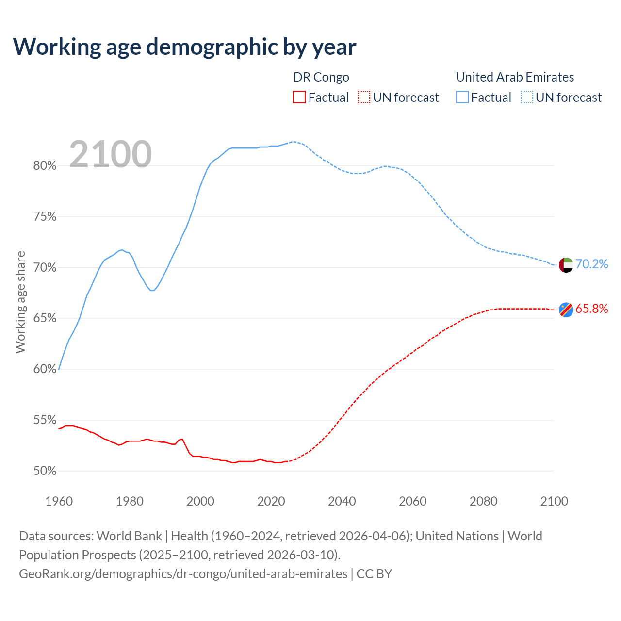 - The DR Congo has 59.8M working age adults (aged 15-64) vs 9.6M in the United Arab Emirates.