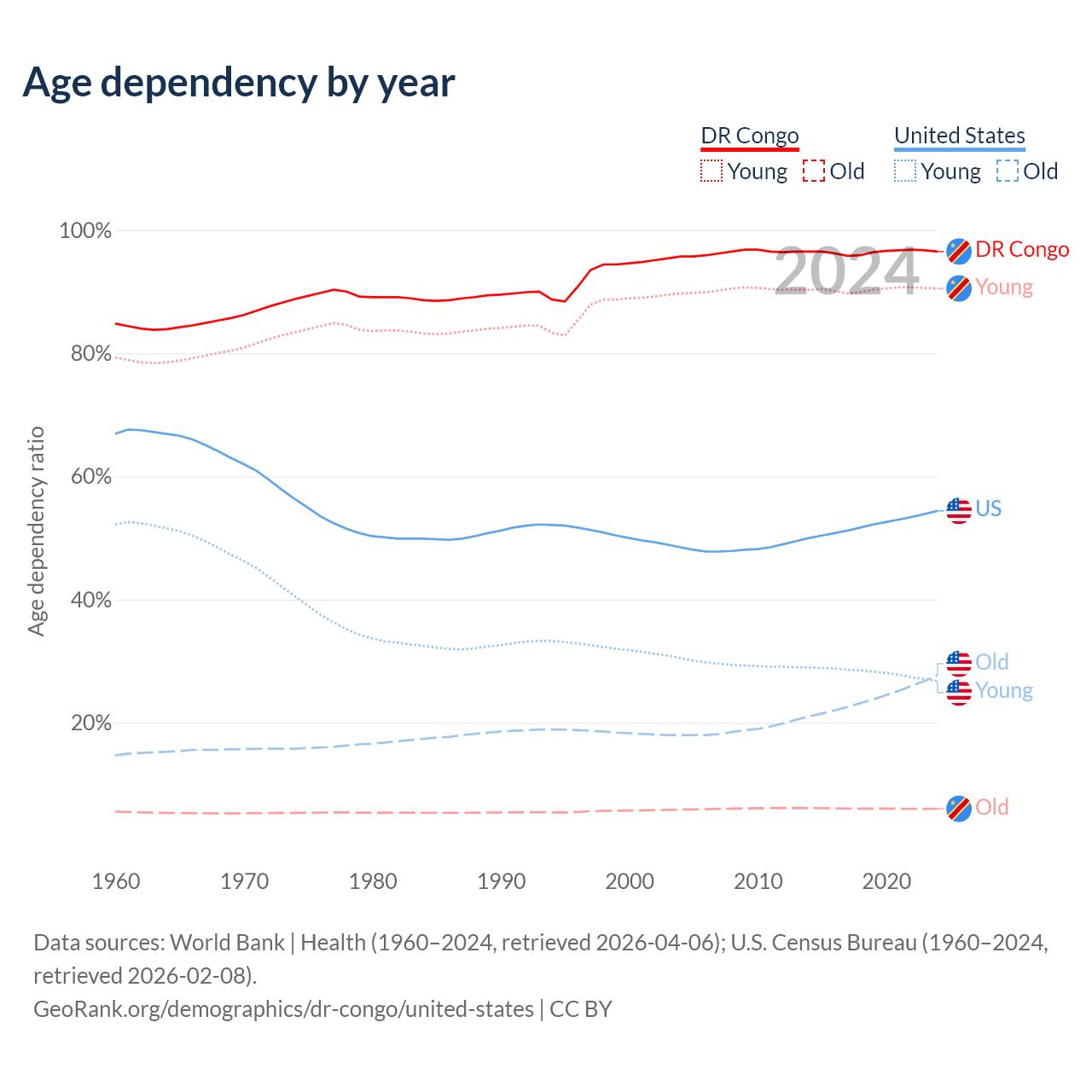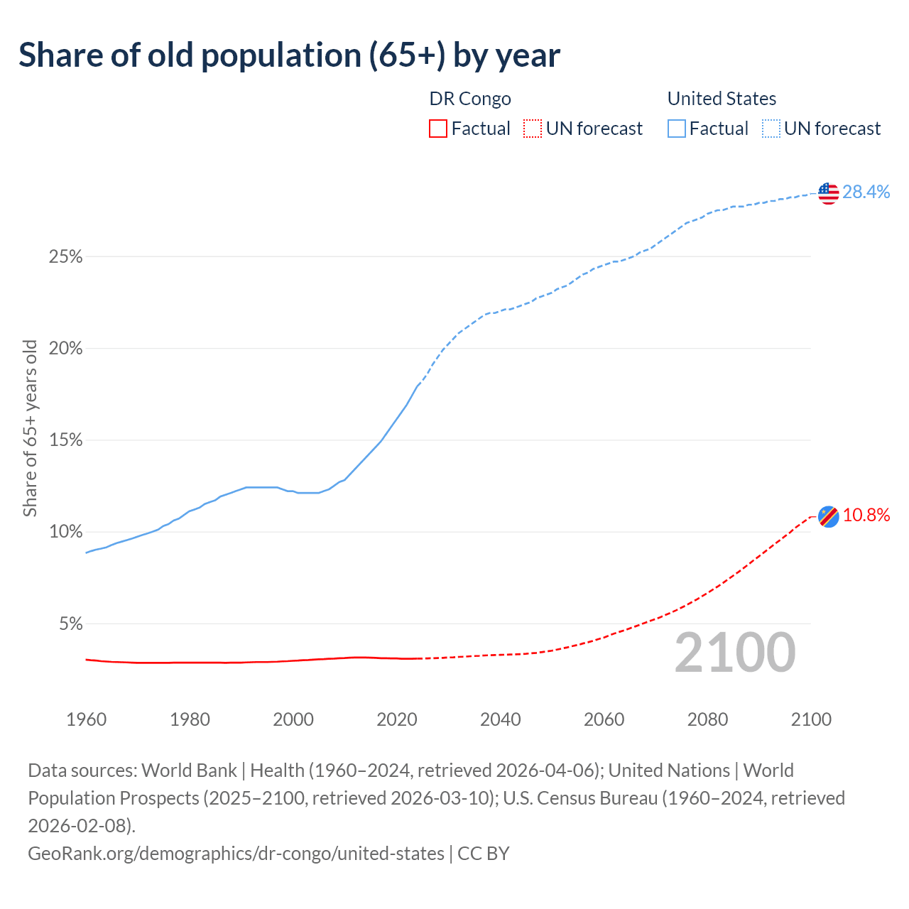 - The share of old-age demographic (65+) in the DR Congo is 3.08% vs 17.9% in the United States.