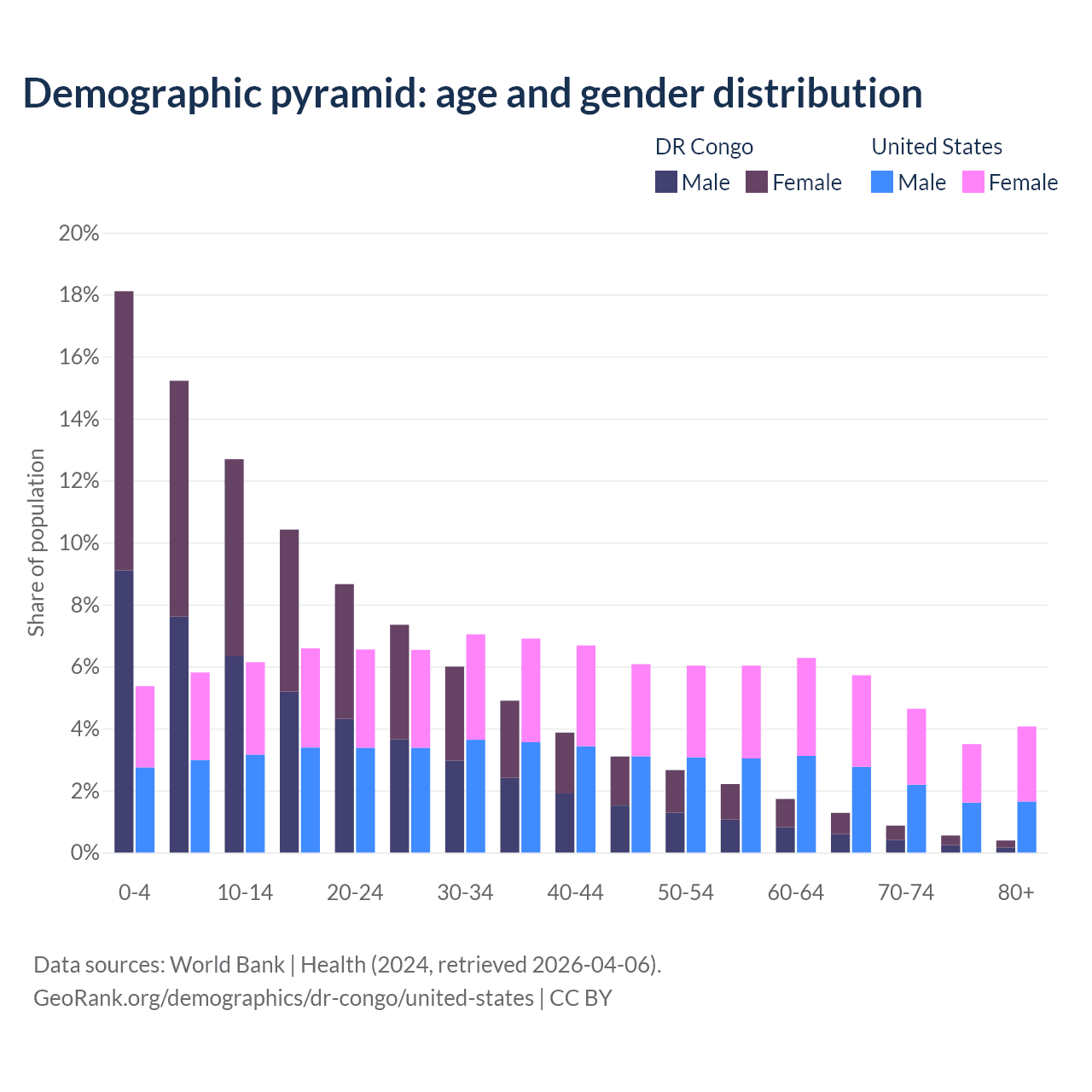 - The DR Congo is ranked 191/196 by median age (oldest to youngest) vs 50/196 for the United States.