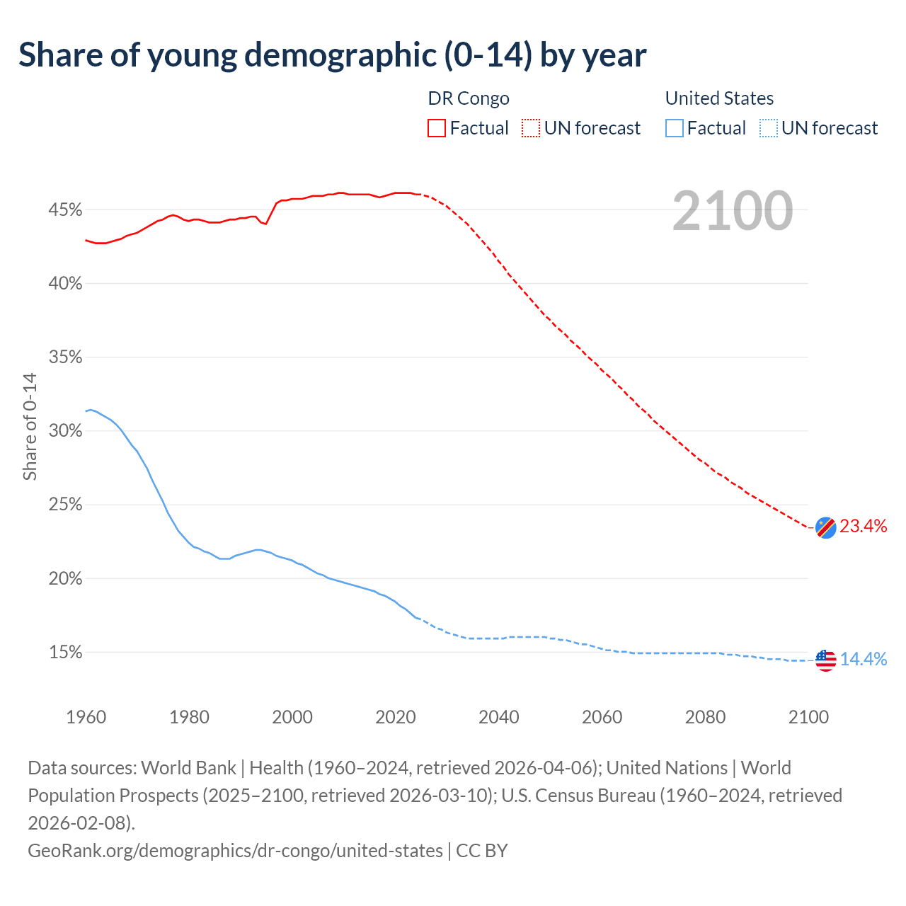 - The share of young demographic (0-15 years old) in the DR Congo is 46% vs 17.3% in the United States.