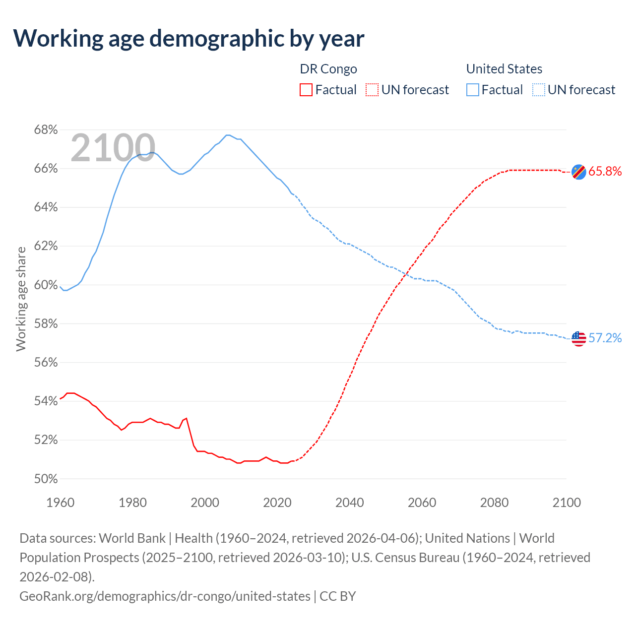 - The DR Congo has 59.8M working age adults (aged 15-64) vs 223M in the United States.