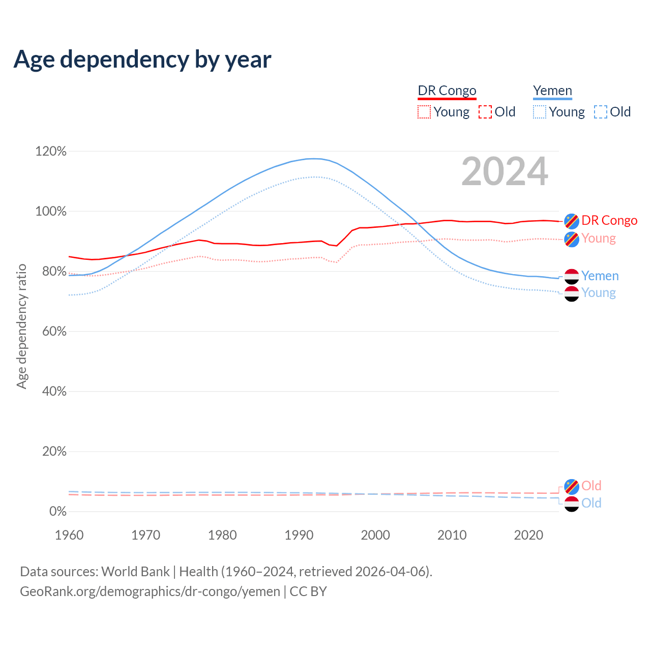 - The share of old-age demographic (65+) in the DR Congo is 3.08% vs 2.52% in Yemen.