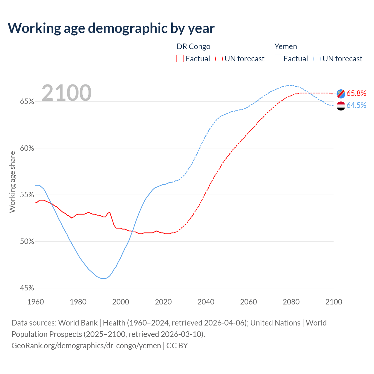 The share of older people aged 65 and over is 3.08% in the DR Congo and 2.52% in Yemen. Life expectancy in the DR Congo compared to Yemen .