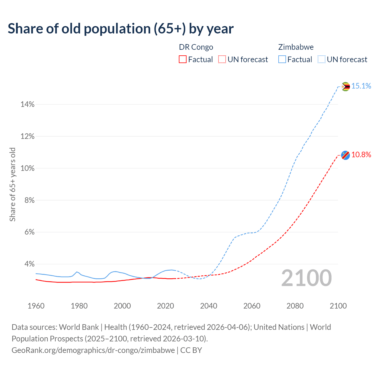 The share of older people aged 65 and over is 3.08% in the DR Congo and 3.6% in Zimbabwe. Life expectancy in the DR Congo compared to Zimbabwe .