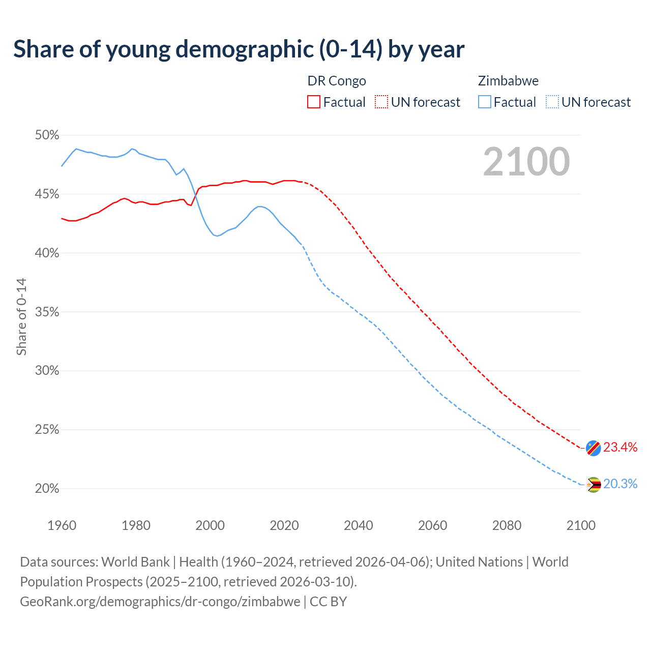 - The share of young demographic (0-15 years old) in the DR Congo is 46% vs 40.9% in Zimbabwe.