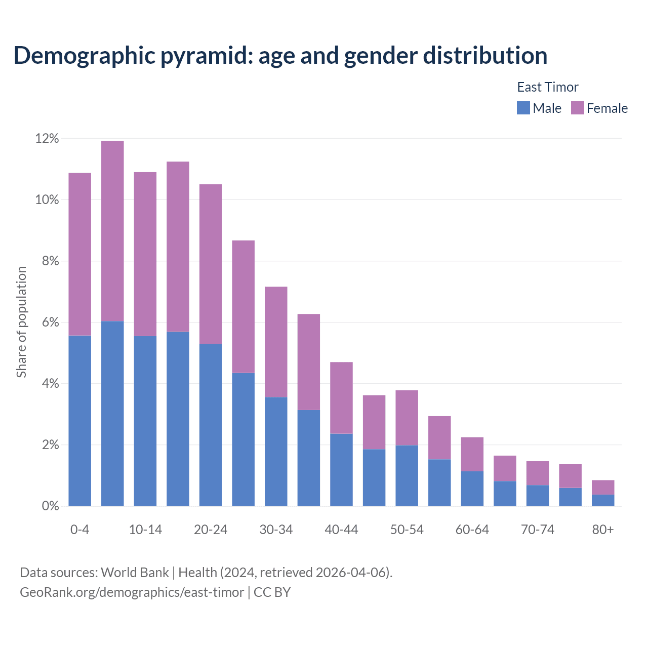 With a population of 1.4M people, East Timor has a median age of 22.4 years which makes it the 145/196 oldest country. 33.7% of the demographic are children 0-14 years old, 61.1% are working-age people aged 15-64, and 5.28% are older population aged 65+ years.