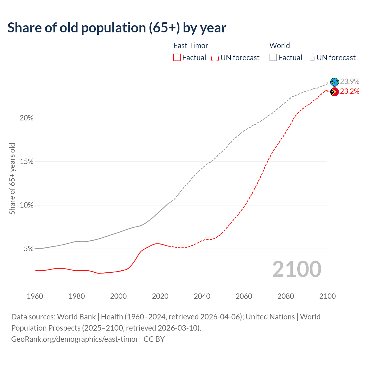 The share of older people aged 65 and over in East Timor increased from 2.6% to 5.28% between 2004 and 2024.