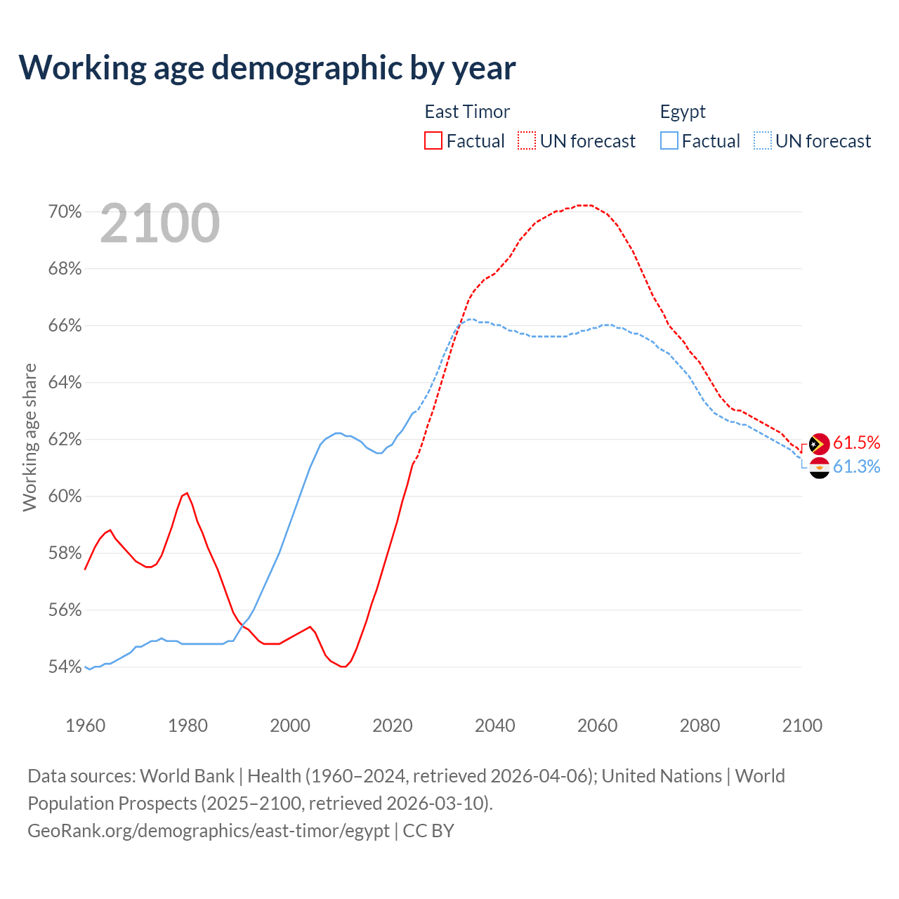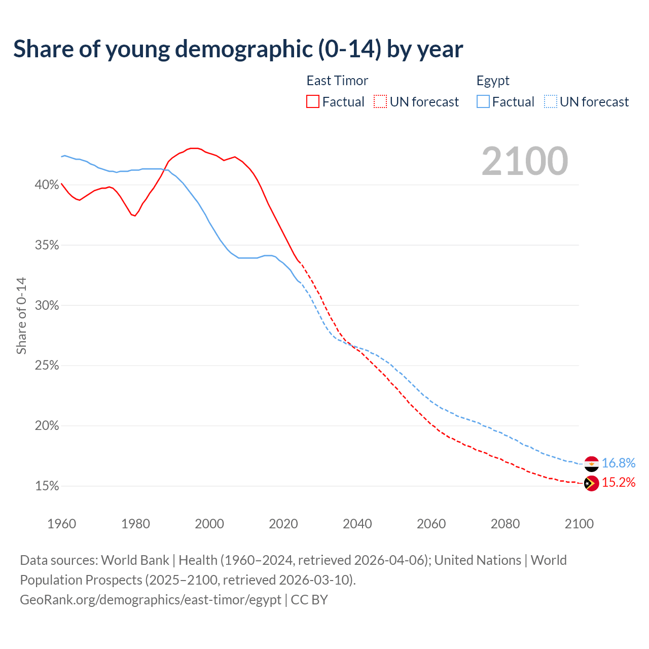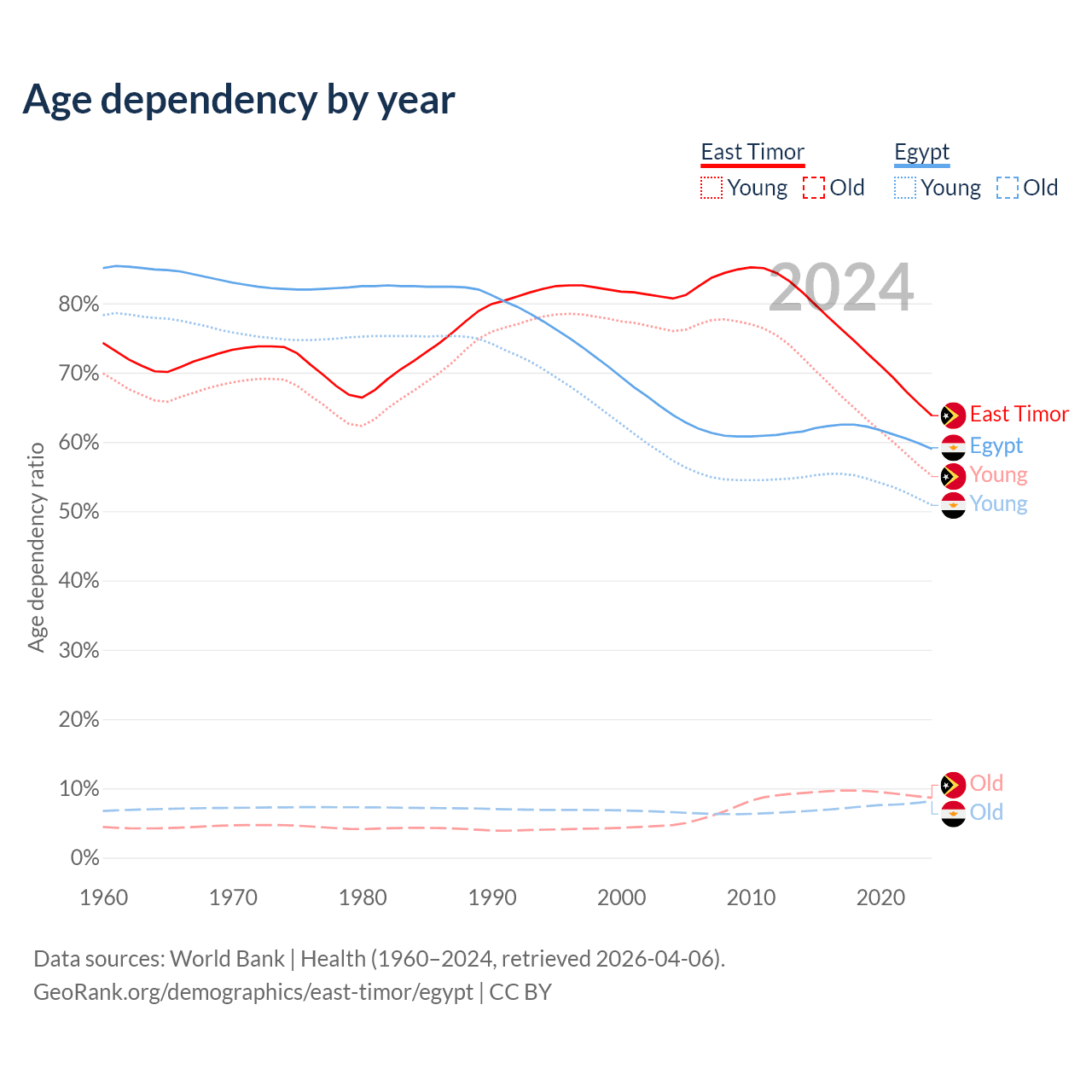 - The share of old-age demographic (65+) in East Timor is 5.28% vs 5.12% in Egypt.
