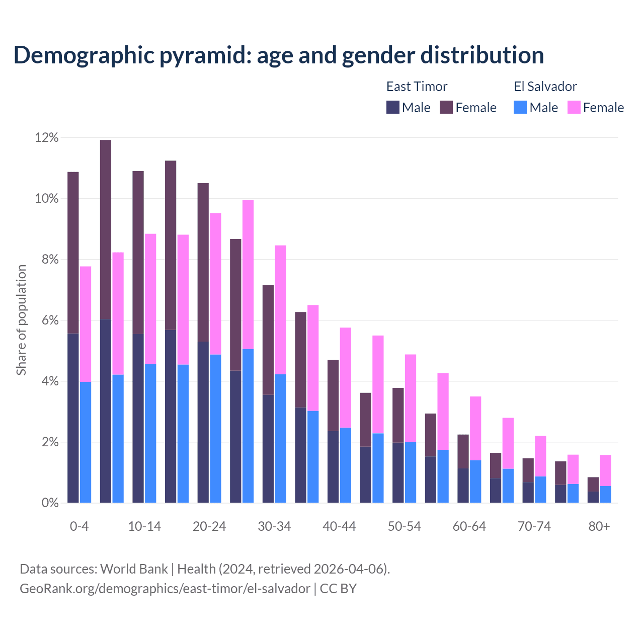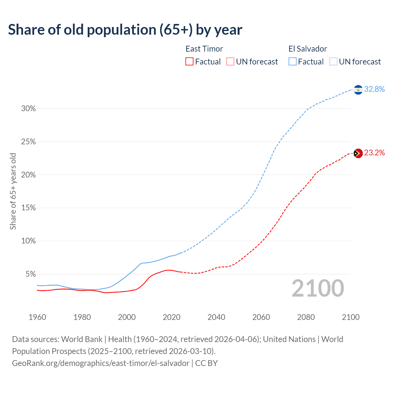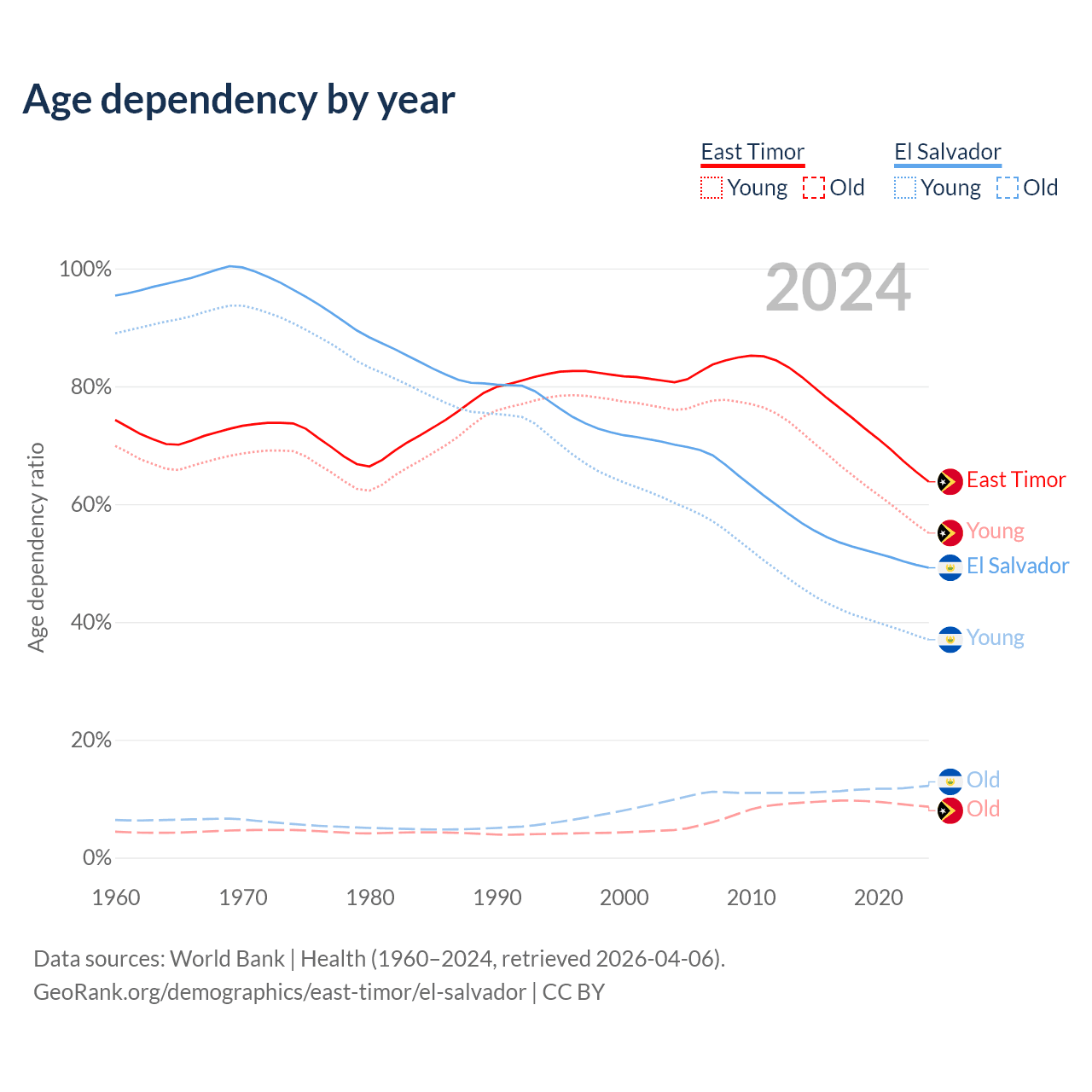 - The share of old-age demographic (65+) in East Timor is 5.28% vs 8.15% in El Salvador.