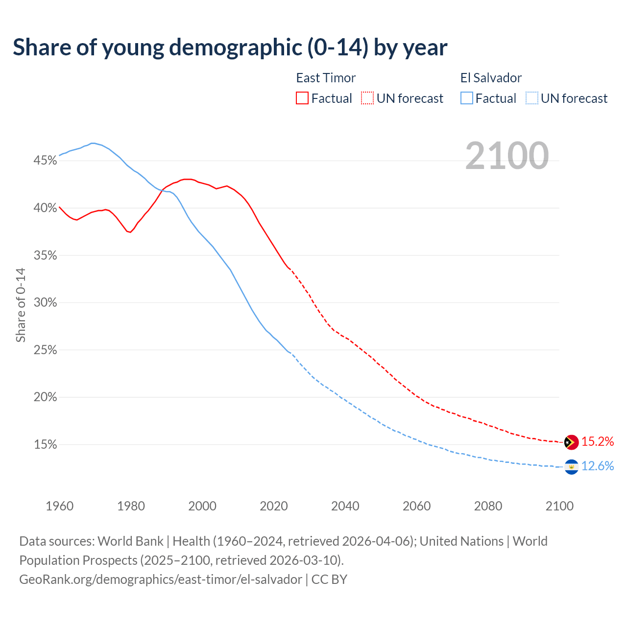- The share of young demographic (0-15 years old) in East Timor is 33.7% vs 24.8% in El Salvador.